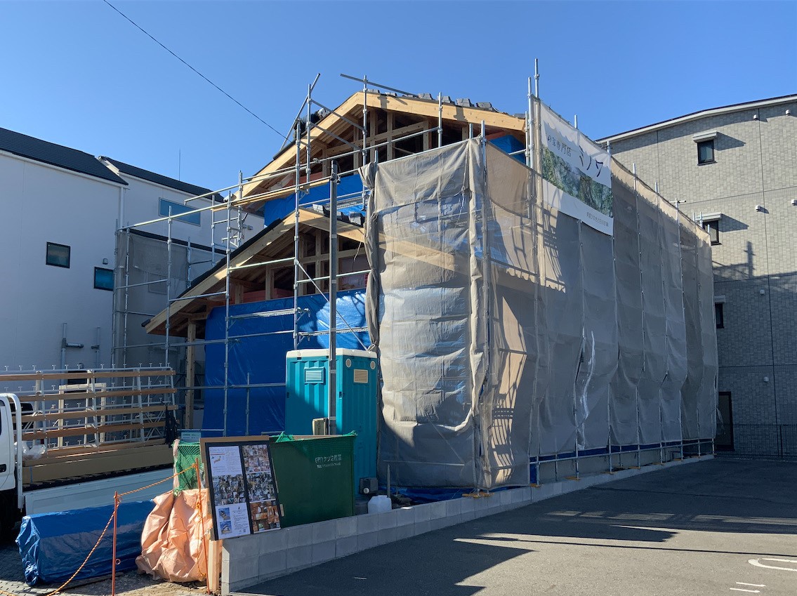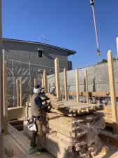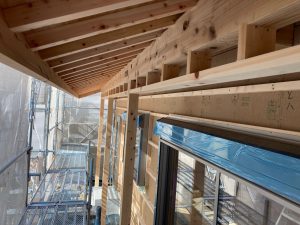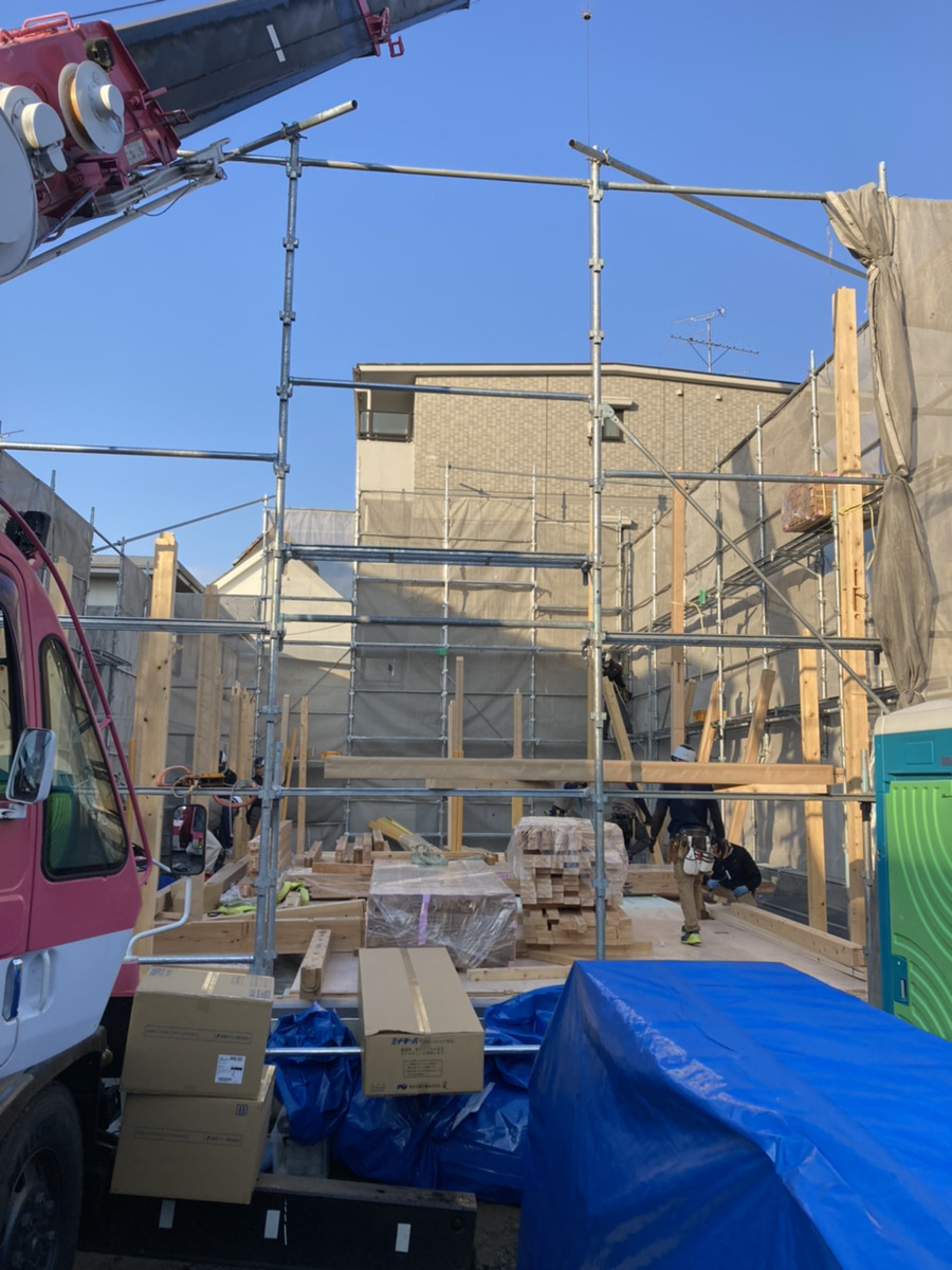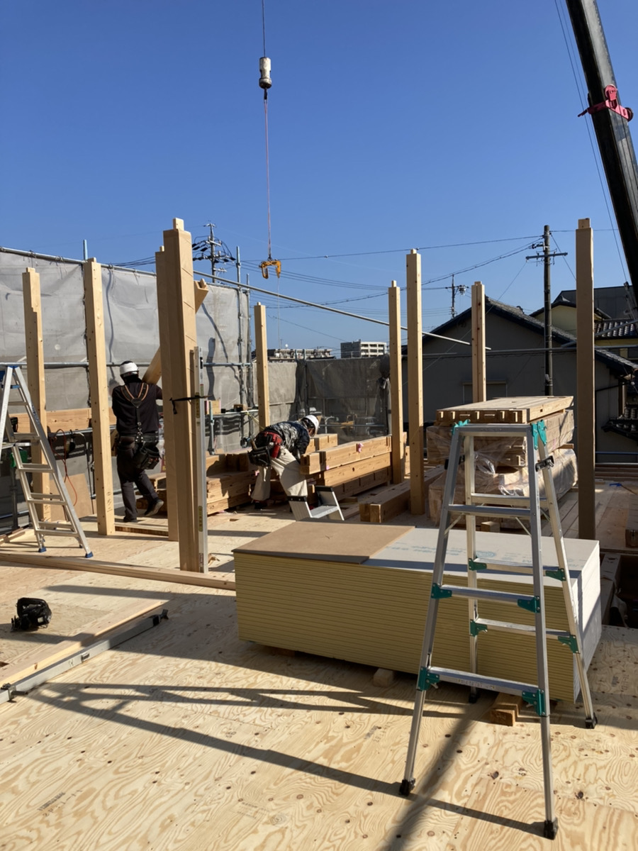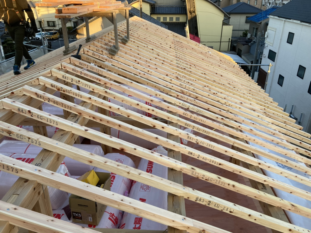 先日までの寒さも和らぎ、快晴の中上棟スタートです。お昼までに2階の梁をかけ、夕方には垂木取付・断熱材の充填まで進みました。