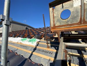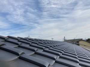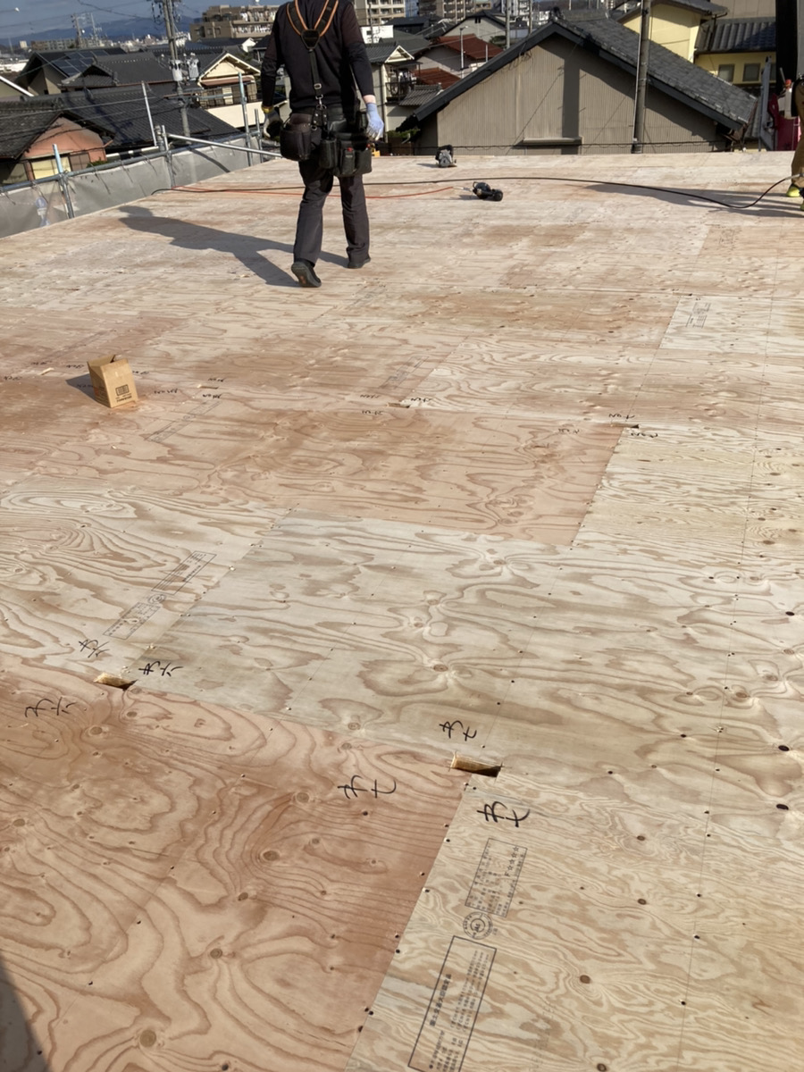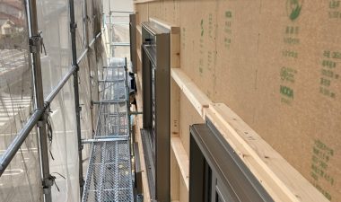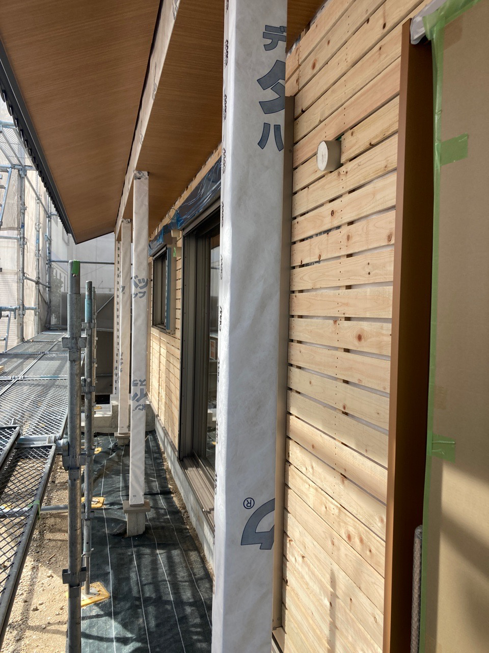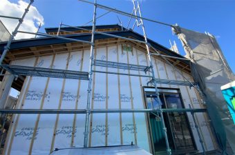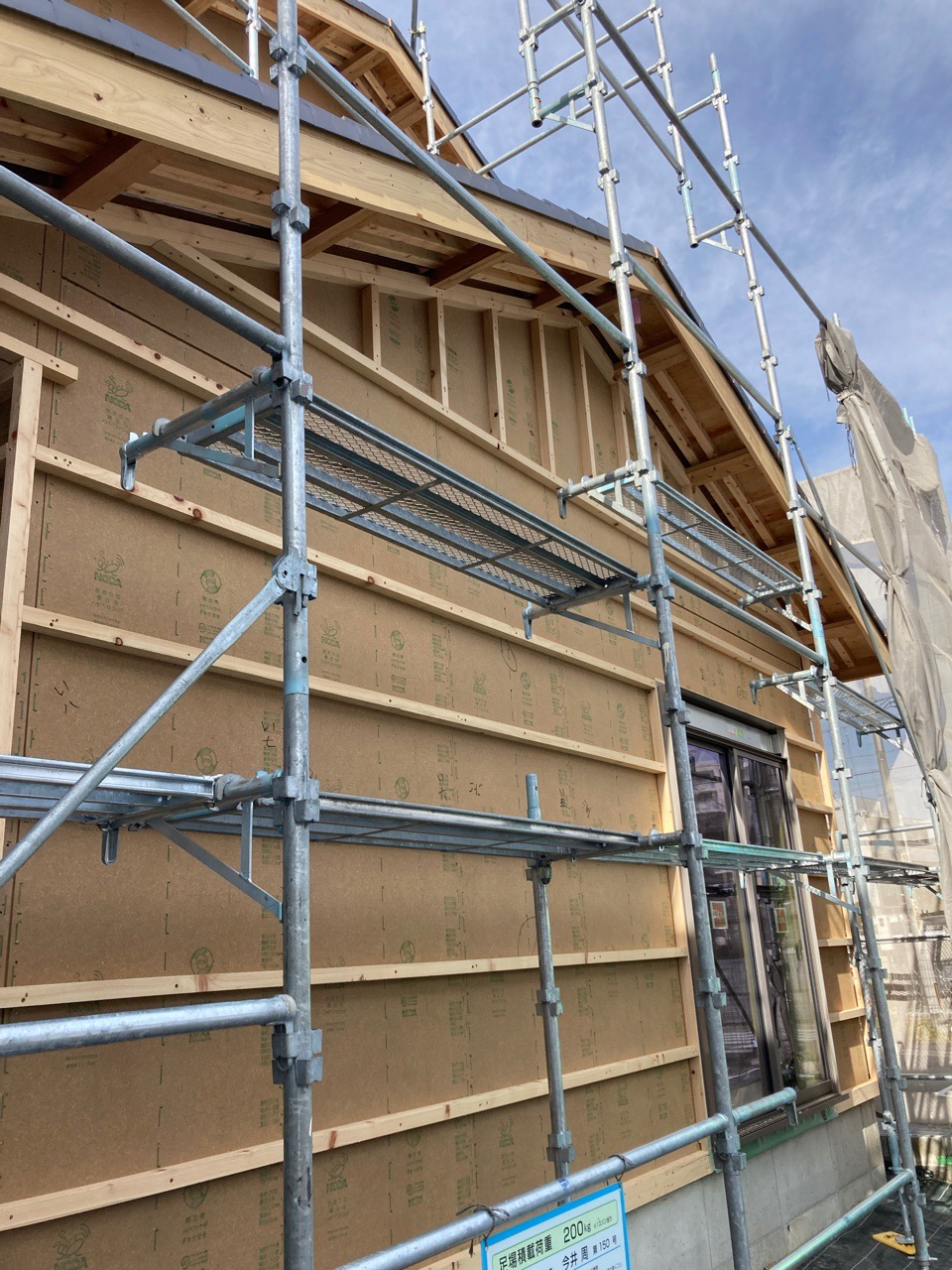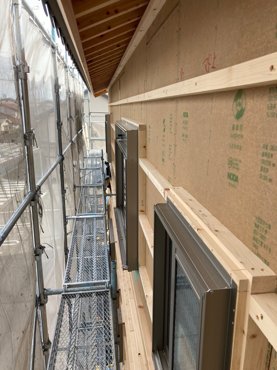 瓦工事が完了し、外部の壁には断熱用下地の取付がされています。この下地の間に高性能グラスウール厚み55㎜を充填していきます。