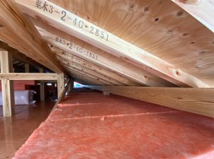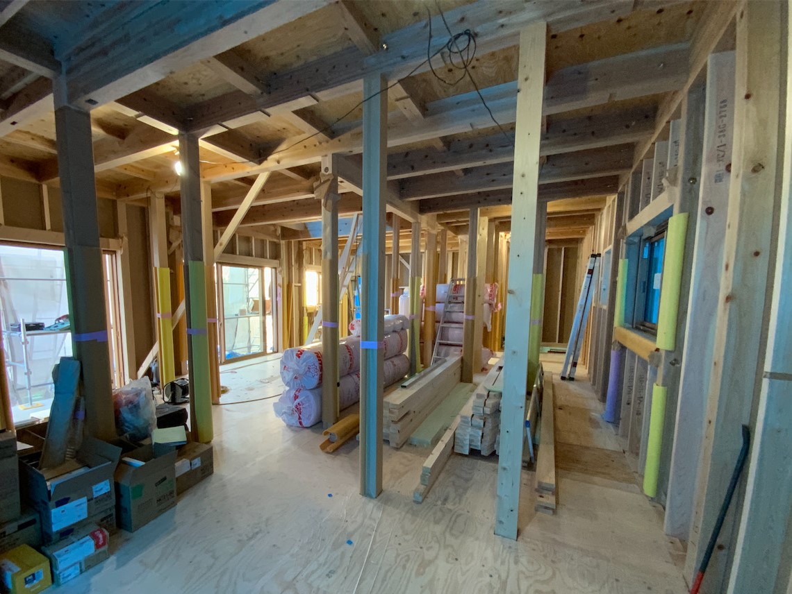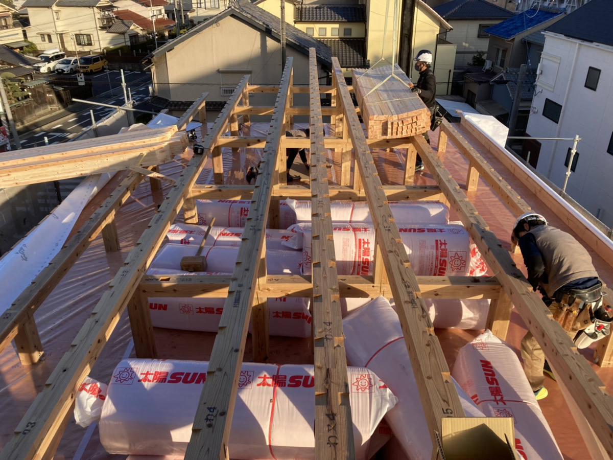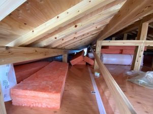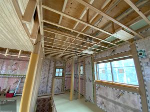 この後、外壁の断熱下地取付や、室内天井の断熱材敷設が進んでいきます。狭くなって施工しずらい屋根が下がっている部分は既に上棟時に充填済みなので、そこから内側に敷設していきます。