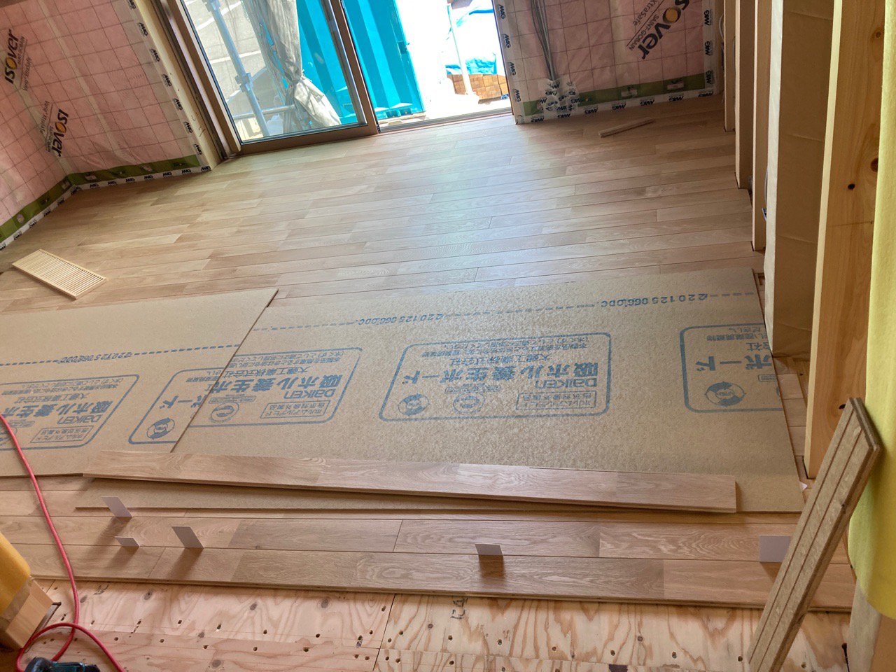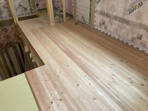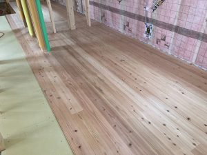 2階の床に杉材を張り進めています。水回り周辺は水に強く堅めで丈夫な竹材を。水回りを除いた1階・2階ともに杉材を選択いただきました。