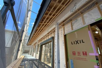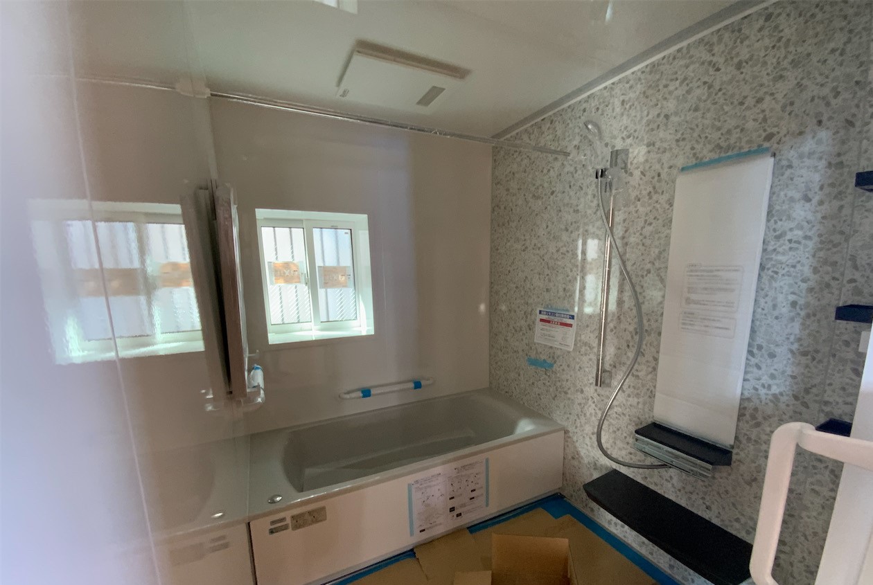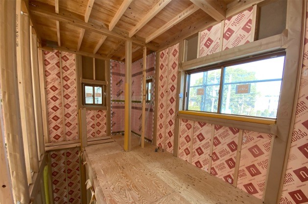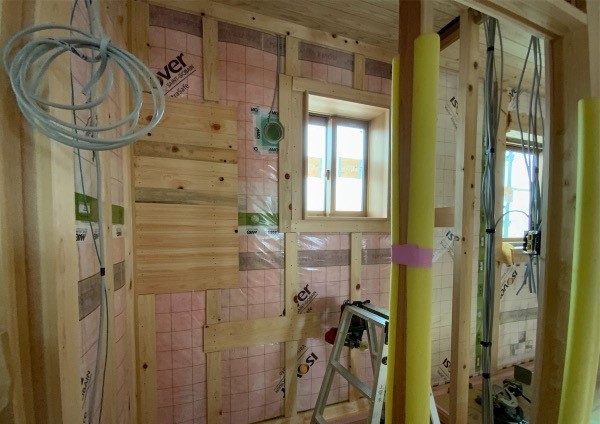 室内の断熱施工が進み、ユニットバスが設置されました。外壁には通気胴縁が施されました。