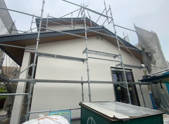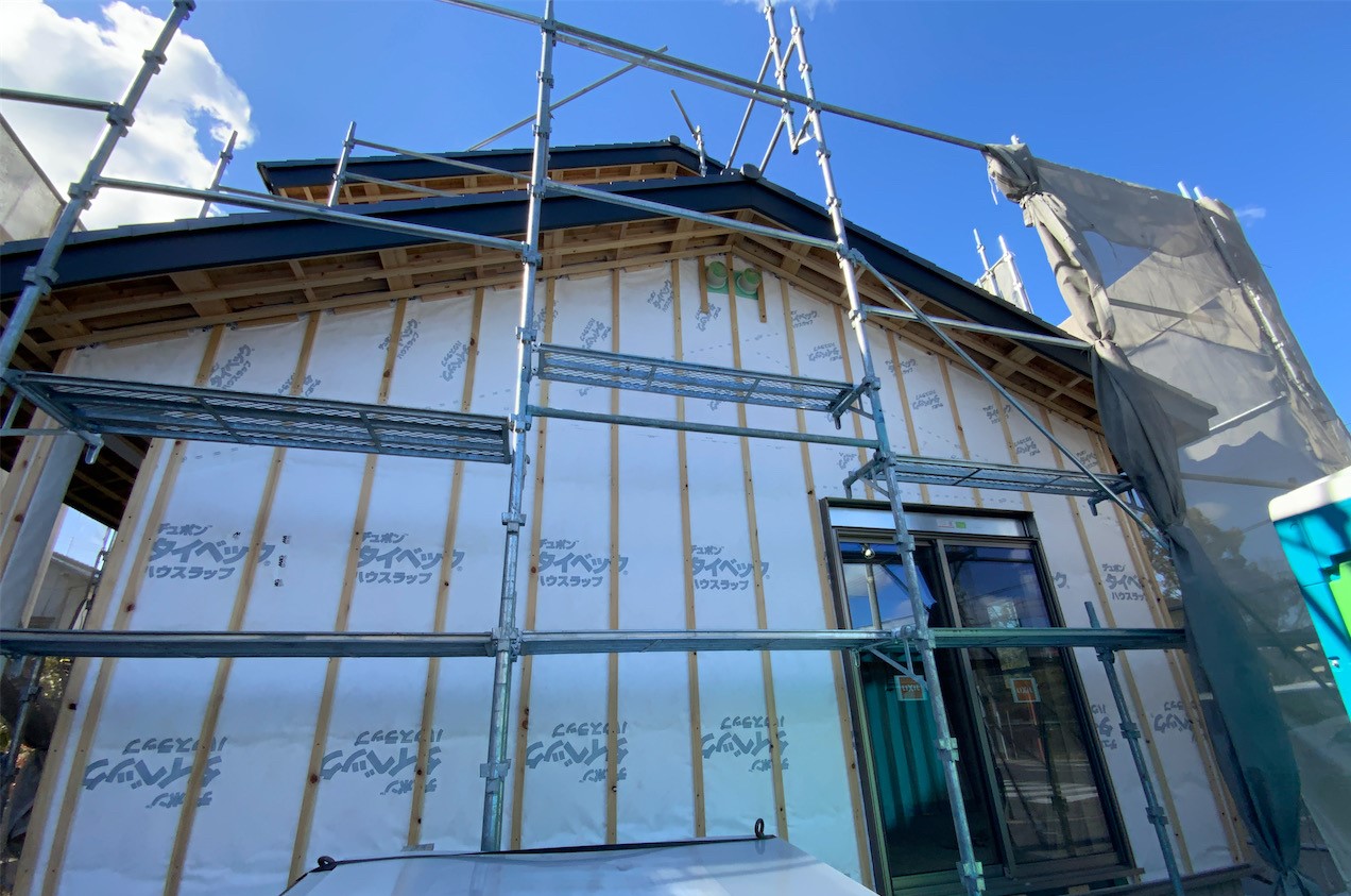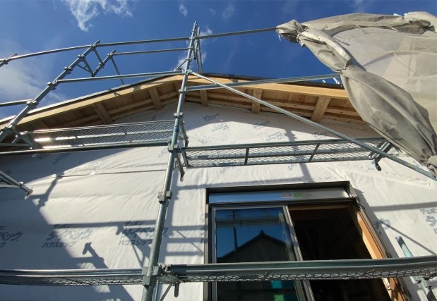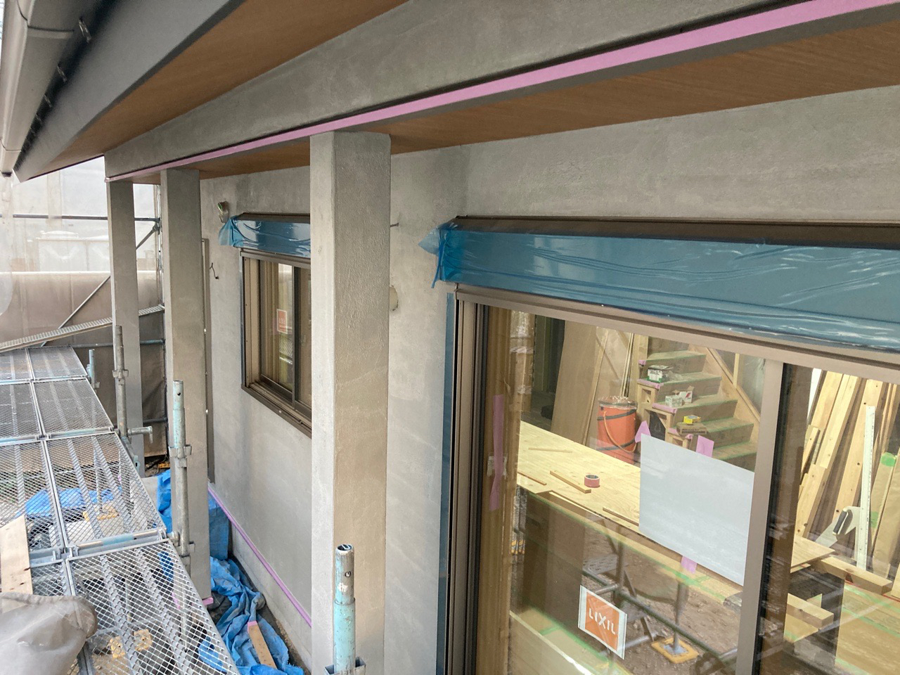 外部はモルタル下地が完了し、乾燥後漆喰を施します。