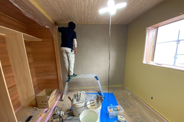 こちらの現場はほとんどの室内を漆喰塗りとするため、まずは2階の壁からプラスターボードを張っていきます。その後プラスターボードの凹凸をパテ処理し、その上からアク防止・仕上げの接着を強化するためシーラーで下処理をしてから仕上げします。