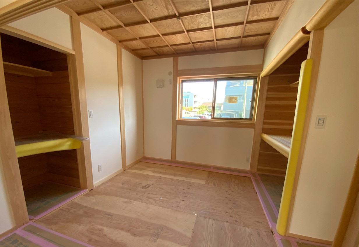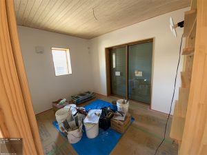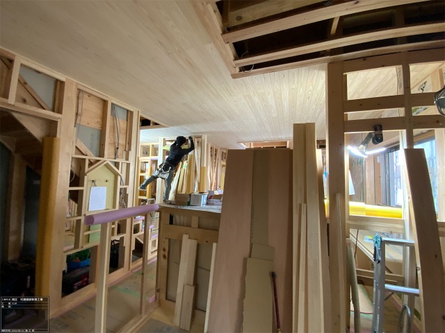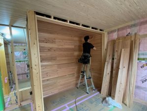 室内建具枠の取り付けが完了し、k保木棟梁は真壁と大壁の境の見切りを打っています。応援のk田くんは物入の杉相ジャクリ板を張り進めています。