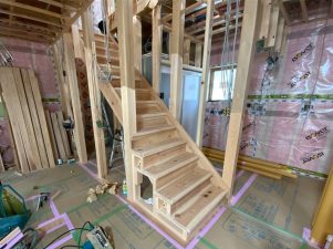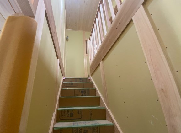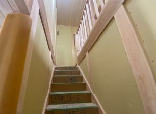 先日造作中だった階段がかけられました。この後壁のプラスターボード張りへと進みます。
