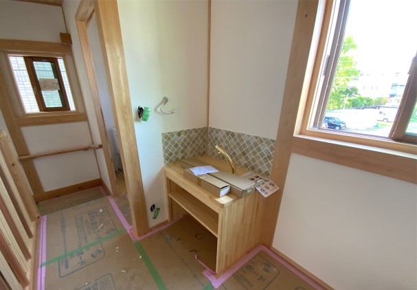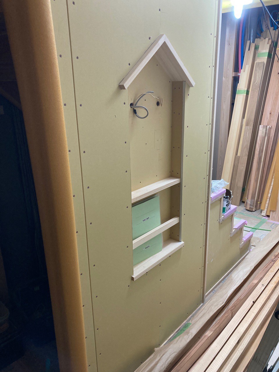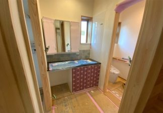 エアコンや手洗いボウル正面のミラーなど、必要な箇所には前もって下地を入れておきます。