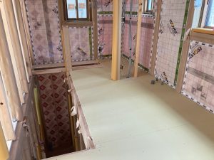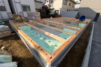 基礎・断熱施工完了後、土台伏せが行われました。作業しているのは、この現場の棟梁k保木さんと応援のh谷川大工さんです。歳が近く、穏やかでまじめな二人組です。前回の現場でも一緒だったので息があってますね!着々と作業を進めています。
