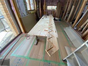 階段の側板の造作に入っています。彫り込まれている部分に踏板・蹴込み板が取り付けられていきます。階段が作られると2階へ材料を運び入れるのが安全で楽になります。床張りはほぼ完了し、k棟梁は養生張り作業中です。