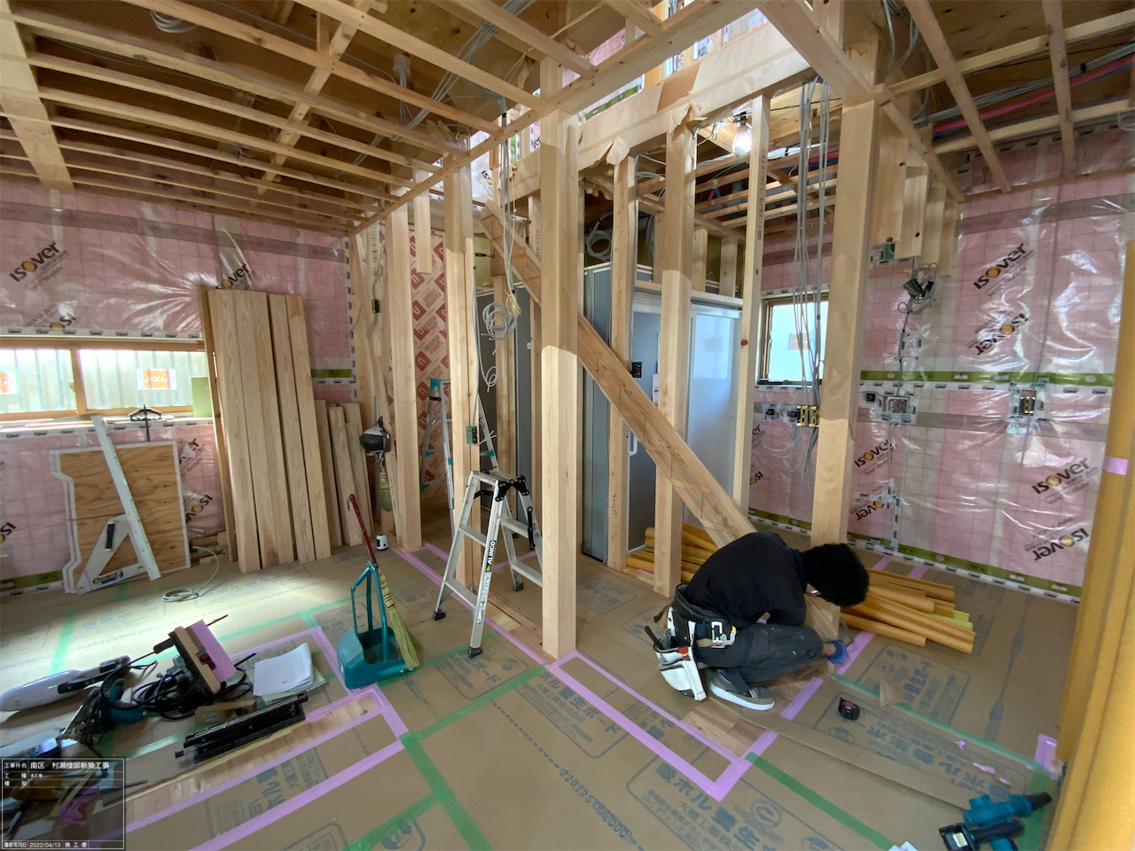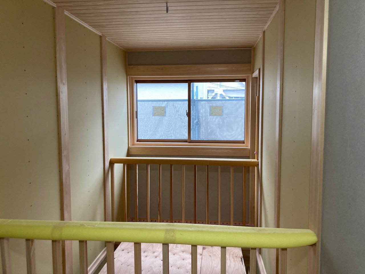 室内は1階でk保木棟梁が廻り縁を取り付け、2階はy本左官さんにより壁下地塗りが進んでいます。