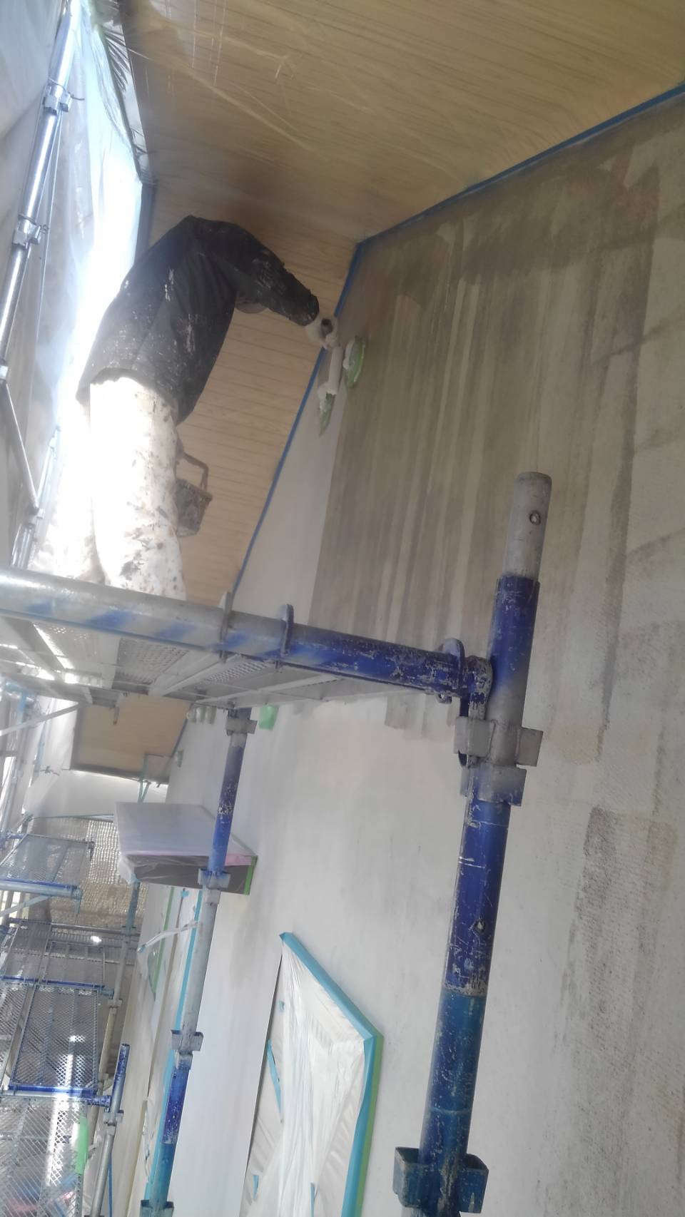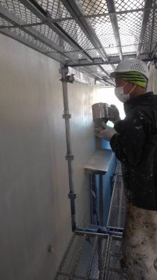 ローラー塗り塗装。多孔質素材のローラーで塗り、表面にわざと凹凸を付けます。学校の校舎などの壁の表面のような形状を想像してもらうと分かりやすいでしょうか。