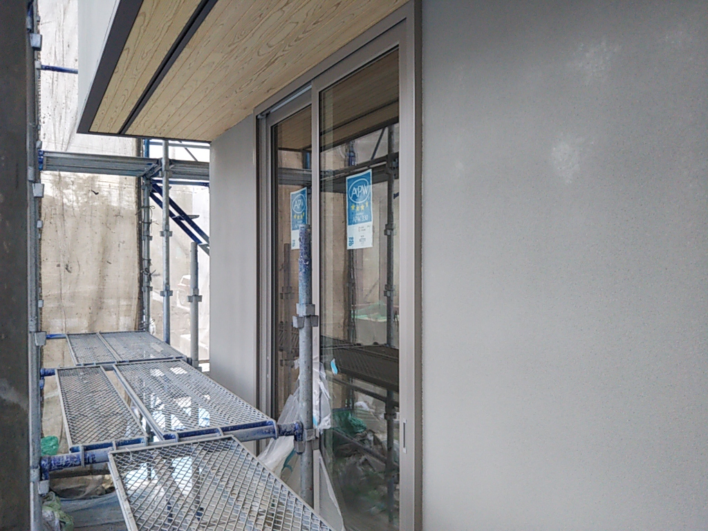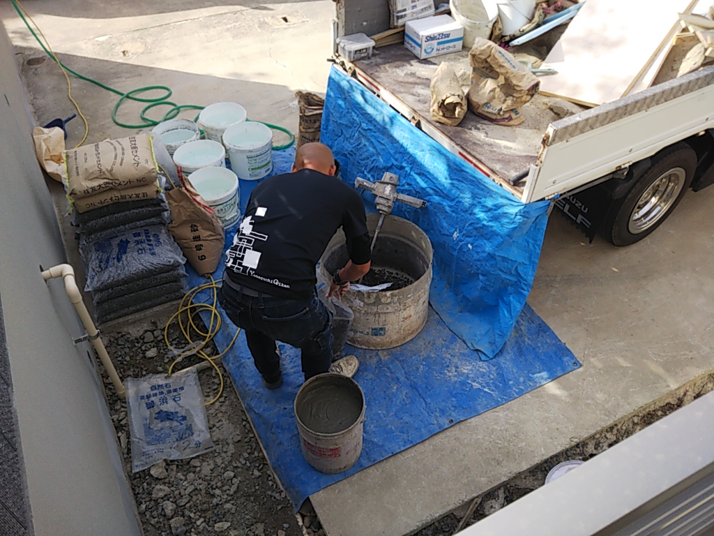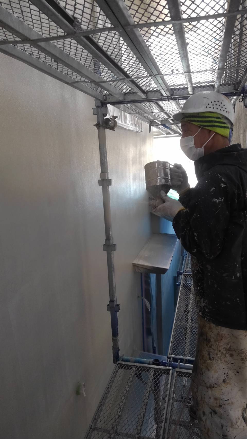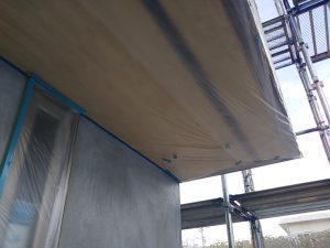 バルコニーでは防水下地の工事を行っています。この上にFRP樹脂で防水層を施します。その際現場は強烈なシンナー臭で充満しますが防水業者さんは手慣れたもの。時々ハイ●ースに材料を積んでくる職人さんもいますが、酔ったりはしないのでしょうか。