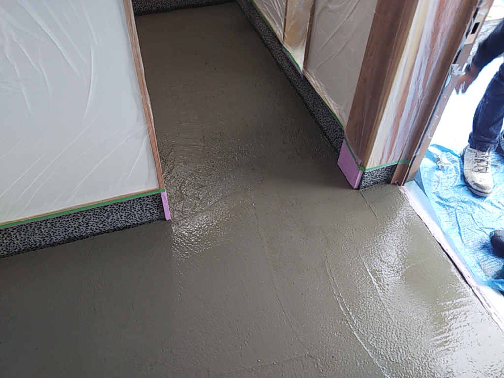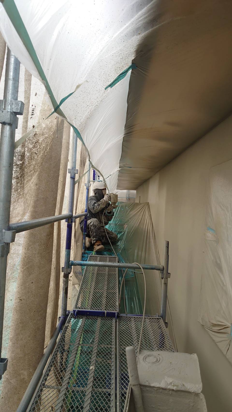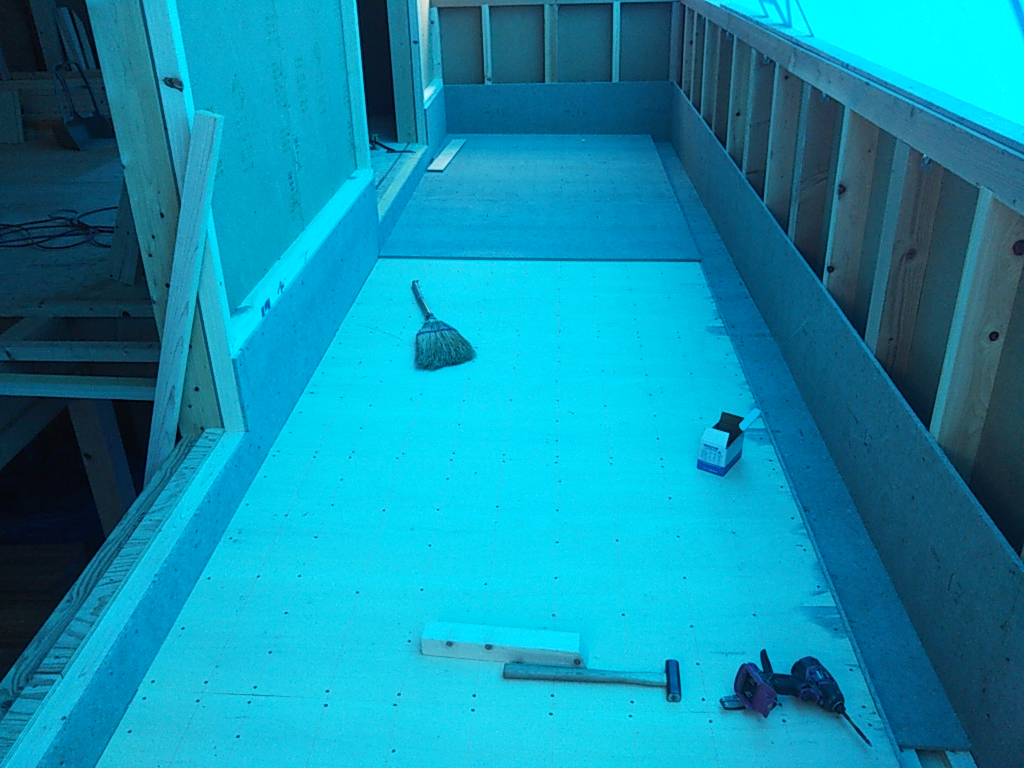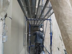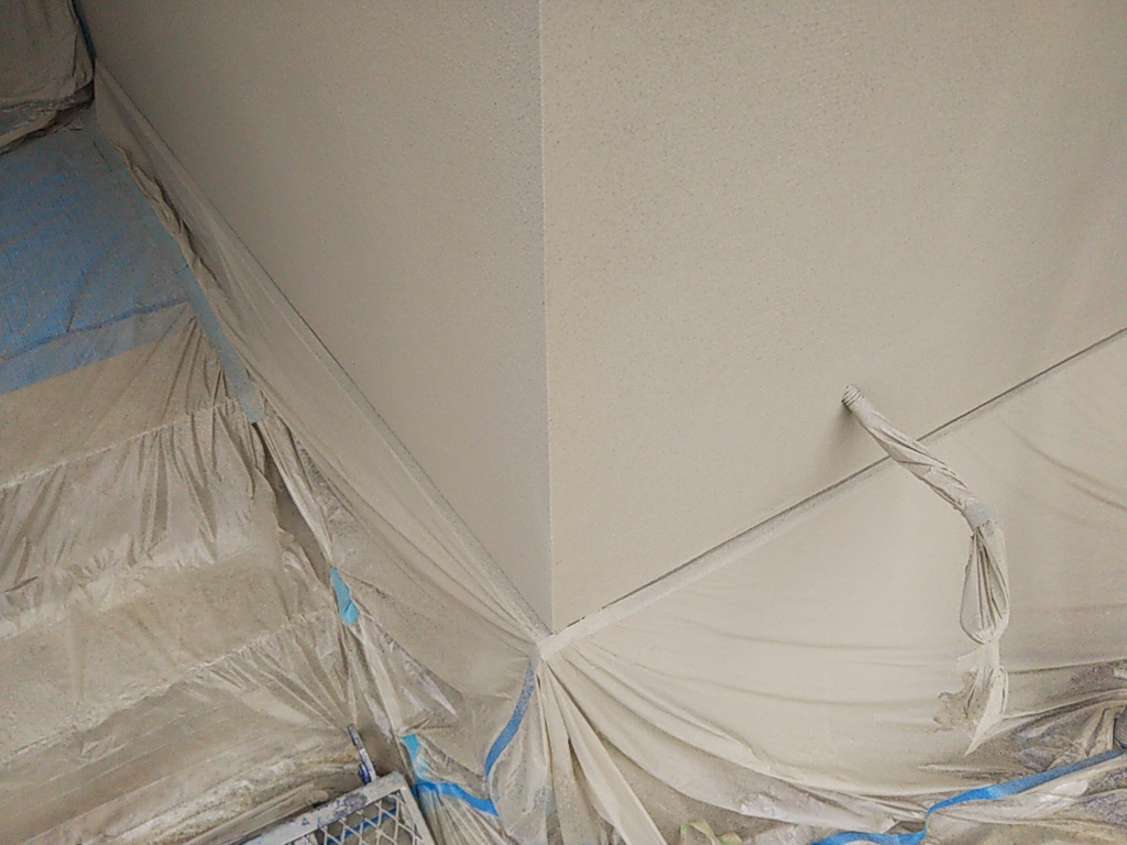 バルコニーでは防水下地の工事を行っています。この上にFRP樹脂で防水層を施します。その際現場は強烈なシンナー臭で充満しますが防水業者さんは手慣れたもの。時々ハイ●ースに材料を積んでくる職人さんもいますが、酔ったりはしないのでしょうか。