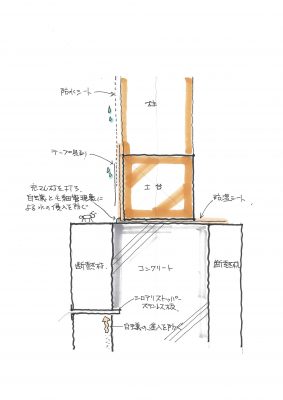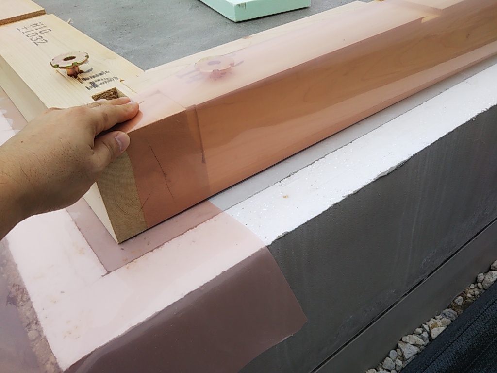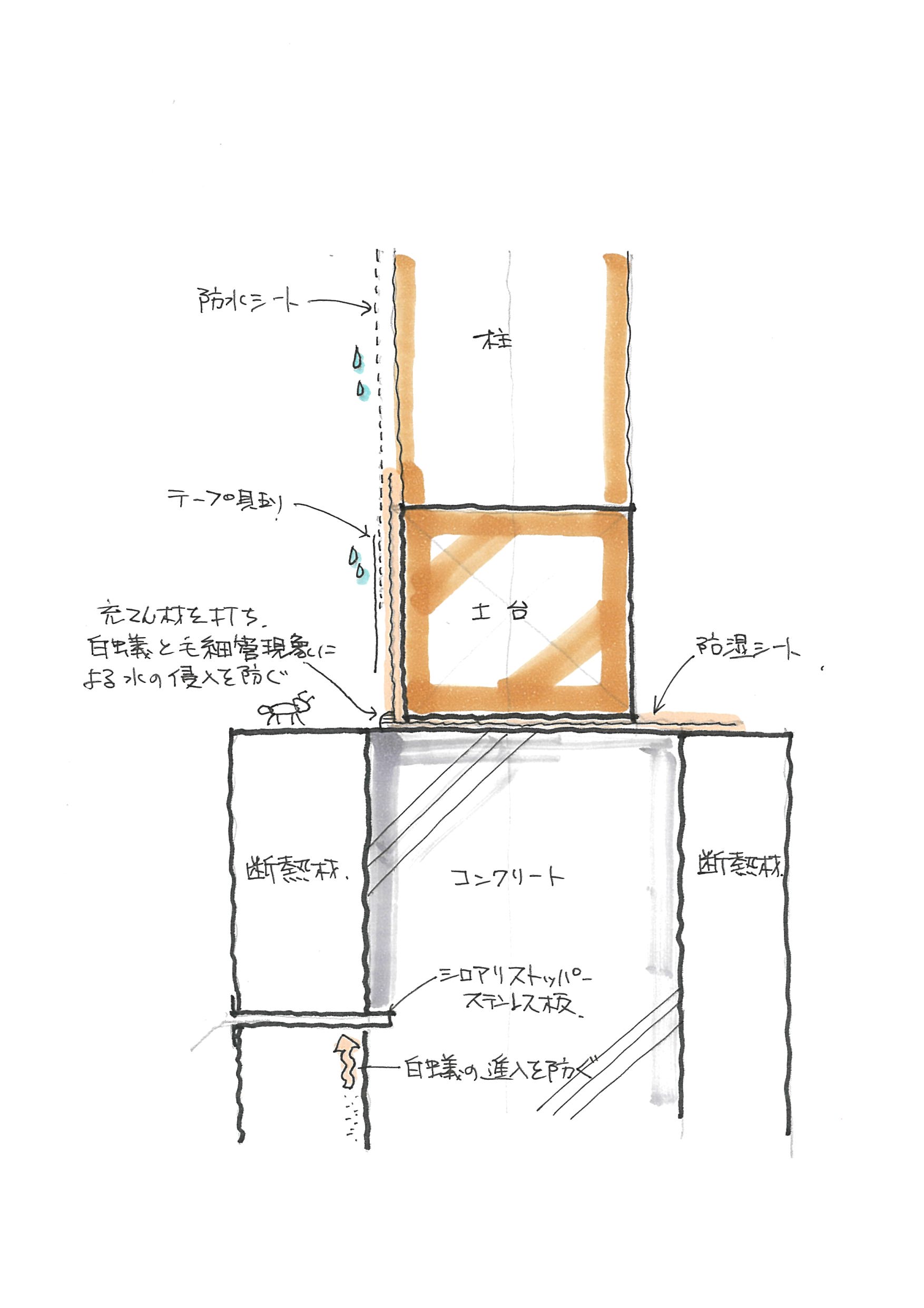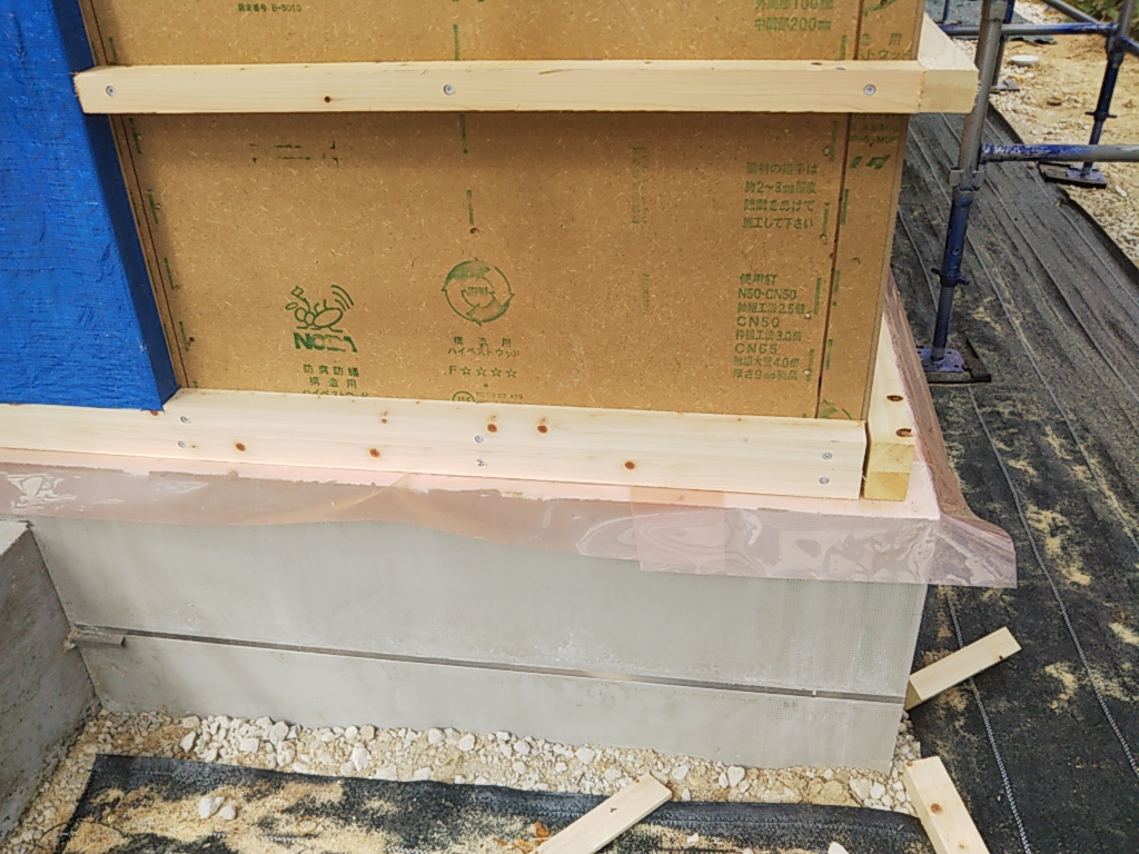 基礎の側面にはステンレス製のシロアリストッパーを施していますが、万一それすら突破するツワモノの蟻が上ってきた場合に宅内への進入を防ぐために土台を敷く前にシートを敷いておきます。 外壁下地を施工する際に右写真のようにシートをめくり上げておいて固定し、シートとコンクリートの間を充填剤で塞ぎます。 土台もコンクリートもまっすぐ施工してはいますが、蟻のような生物にとってはわずかな隙間も進入口となるためその隙間も塞ぎます。 また、土台の高さまでシートで覆い、外壁の防水シートと連結する事で、外壁を施工した後万一外壁仕上材から雨水が侵入して、防水シート表面を伝い基礎上面まで滴ってきても、毛細管現象で基礎内側へ水が侵入する事も防ぐ効果があります。