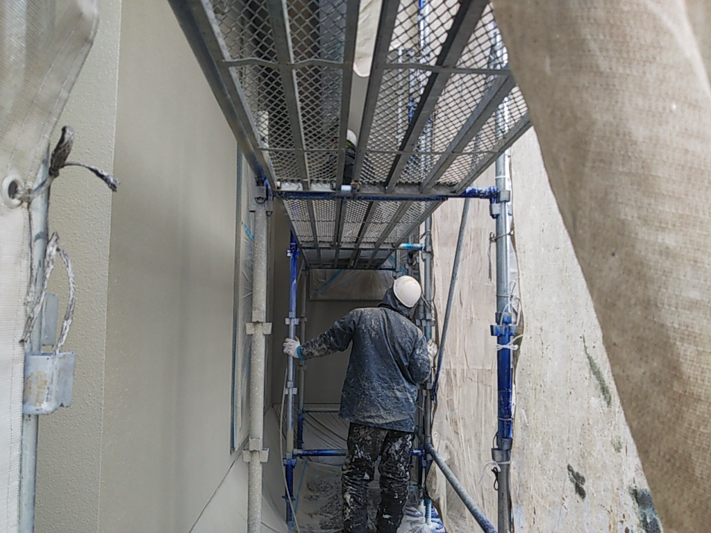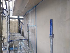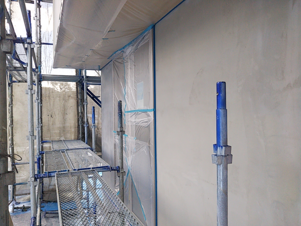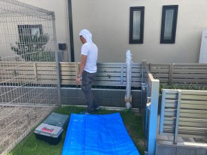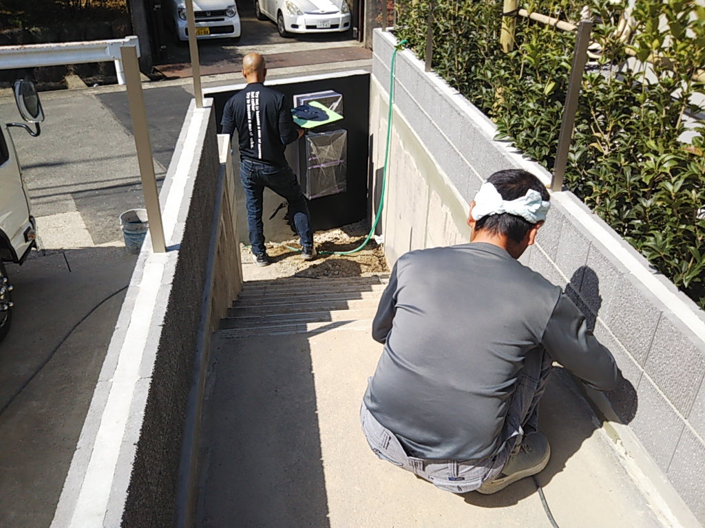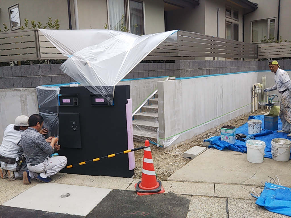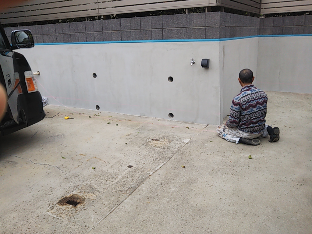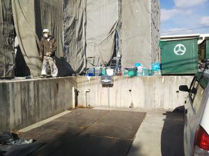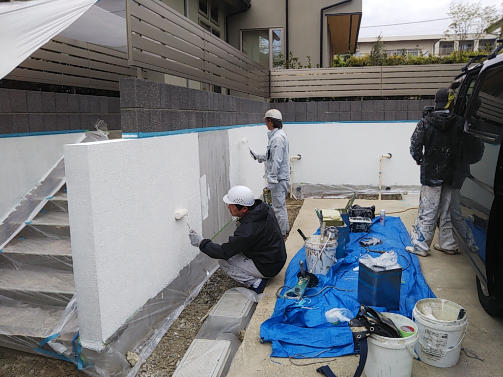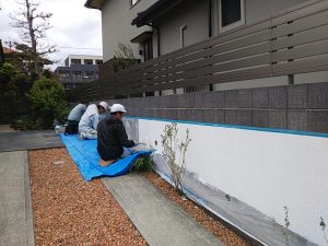 y様邸より以前にこの土地に建物が建っていた時から駐車場にそびえる擁壁も長年の風雪にさらされ表面がだいぶ汚れており、今回は新たに塗装工事をされることになりました。日にちも押し迫ってきた中、折り悪く雨天の予報。当日早朝まで祈るような気持ちでいたところ、天候が少しだけ回復。この日の雨は夜からという予報に変わりました。すんでのところで塗装業者さんに頼み込み、何とか養生をしながら作業をしてもらえることになりました。