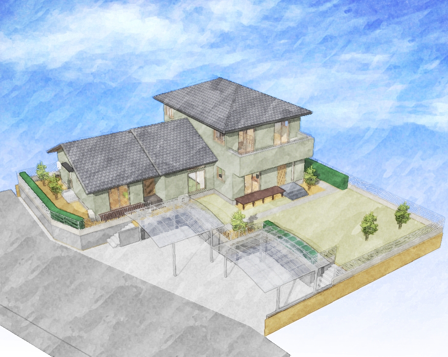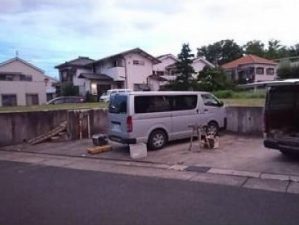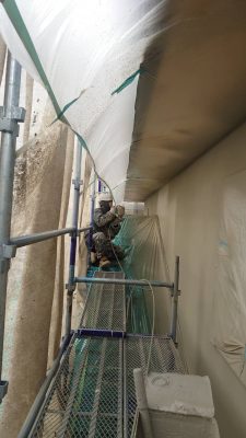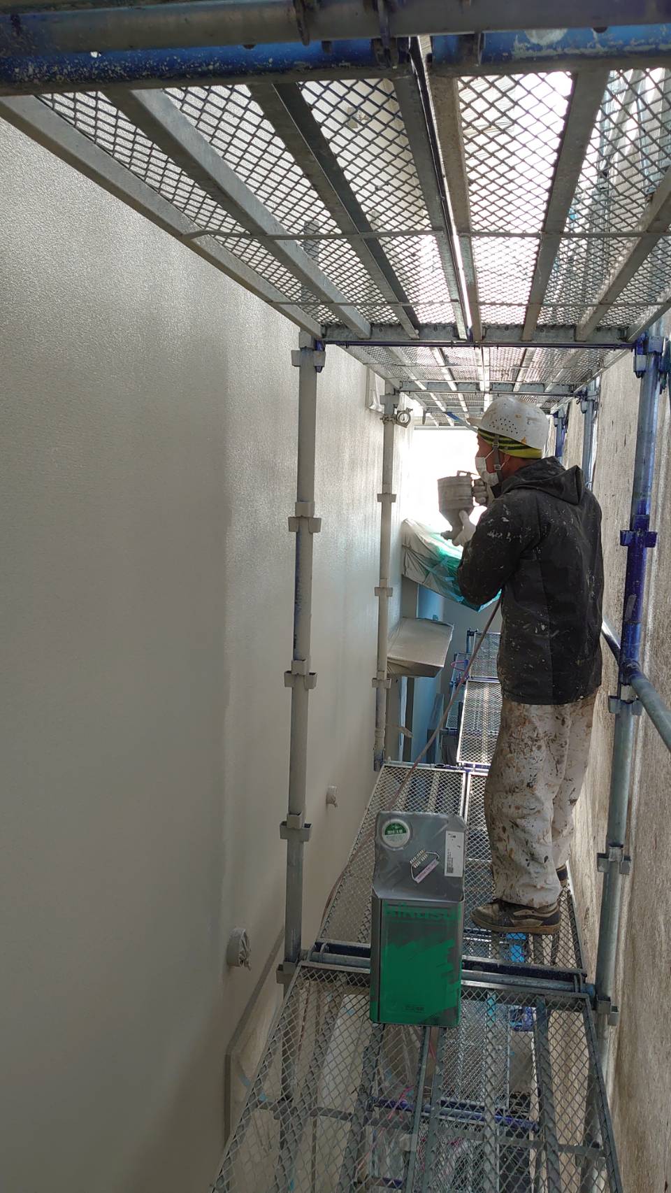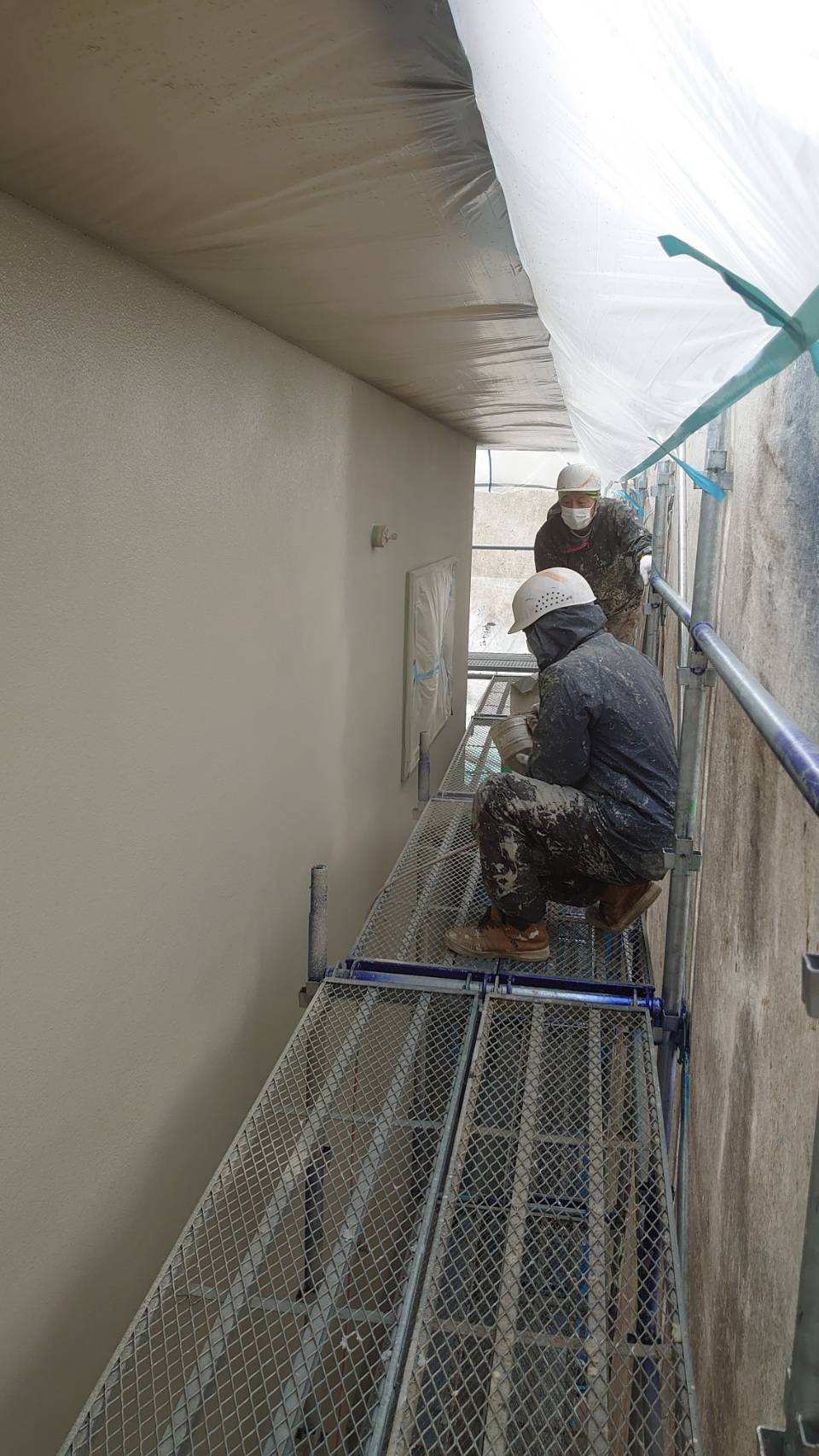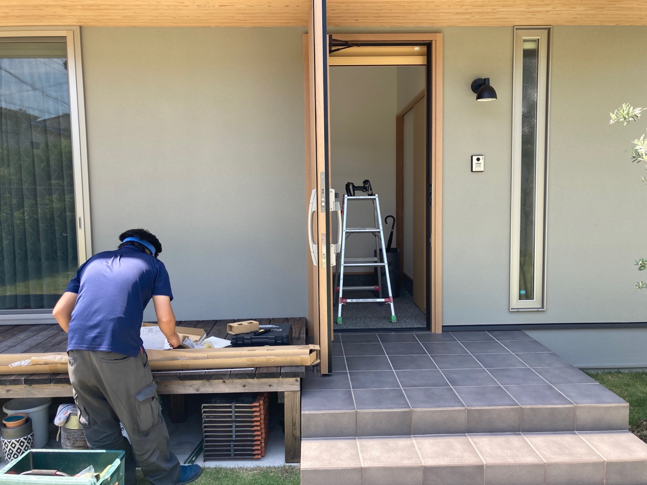 y様邸より以前にこの土地に建物が建っていた時から駐車場にそびえる擁壁も長年の風雪にさらされ表面がだいぶ汚れており、今回は新たに塗装工事をされることになりました。日にちも押し迫ってきた中、折り悪く雨天の予報。当日早朝まで祈るような気持ちでいたところ、天候が少しだけ回復。この日の雨は夜からという予報に変わりました。すんでのところで塗装業者さんに頼み込み、何とか養生をしながら作業をしてもらえることになりました。