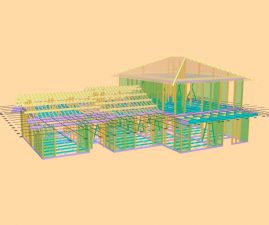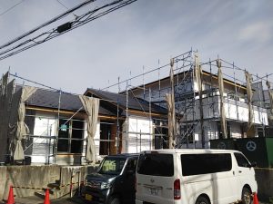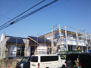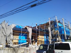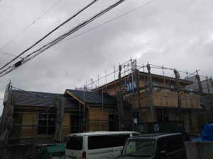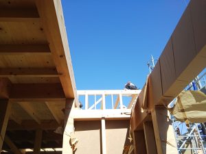 2階部分の寄棟屋根の母屋がかかり始めました。平屋部分の屋根と2階建て部分の壁が接するところには屋根の形にボードと断熱材を先に張っておきます。今回は建築基準法上『長屋』という形式での申請です。『一戸建ての住宅』と違い、両住戸間の堺となる壁は『界壁』として防火性能、遮音性能の仕様を満たす必要があり、あとで施工しにくい部分はこうして先に作業しておきます。