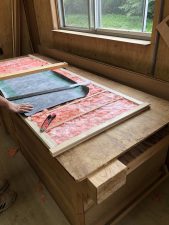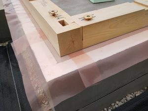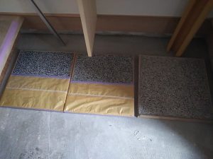貼り付け終わるまでドキドキでしたが無事に終了。接着剤が乾くまで調整のかまし物はそのままです。
