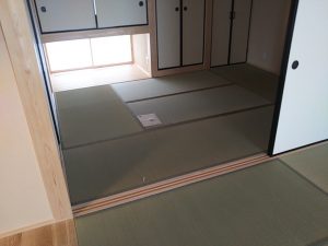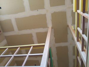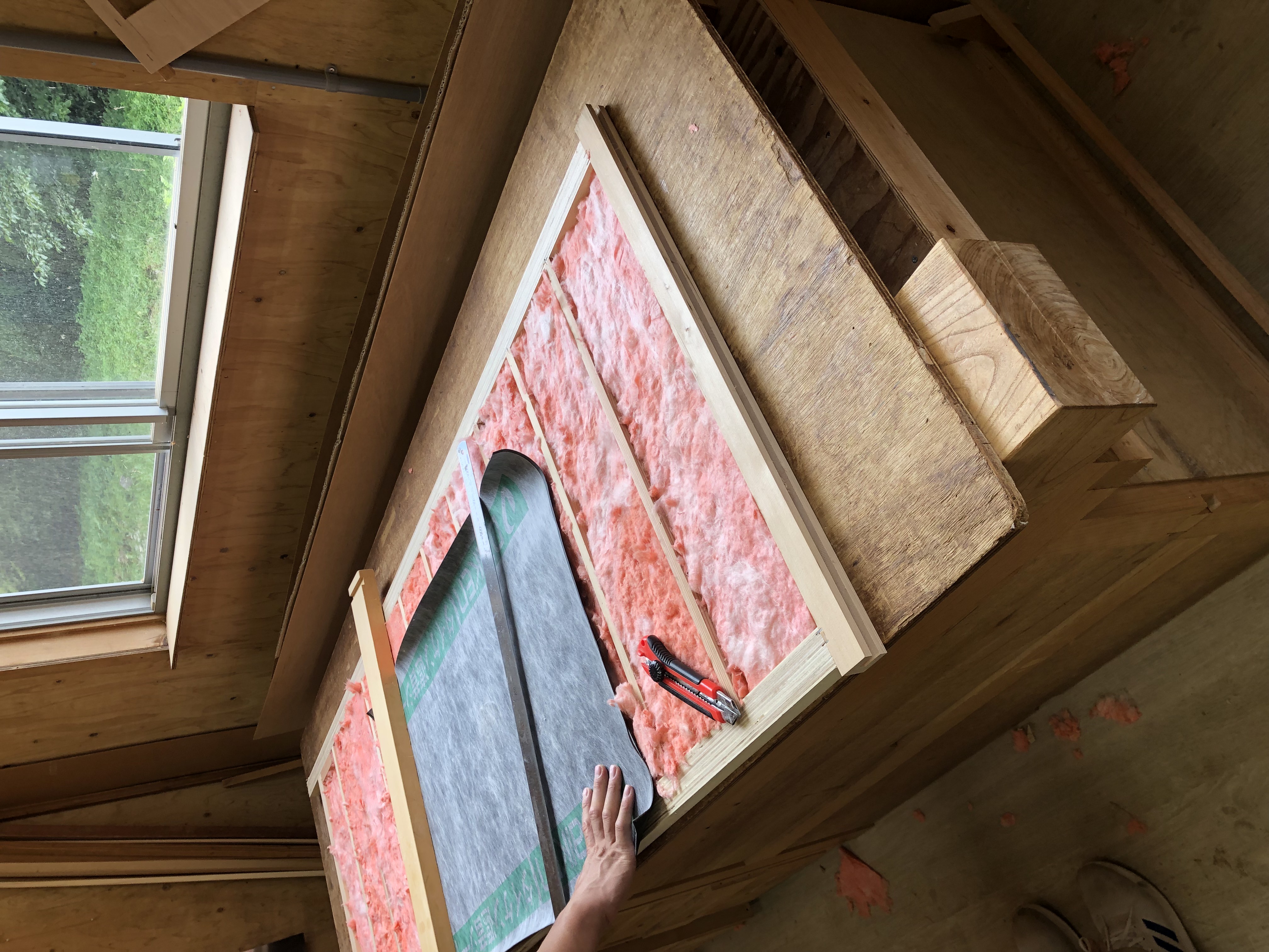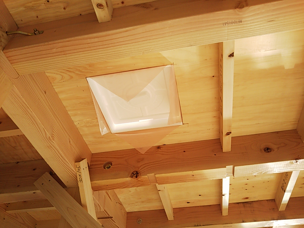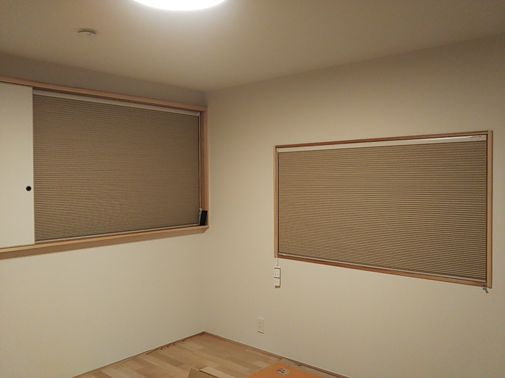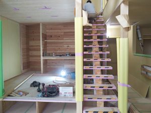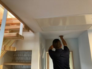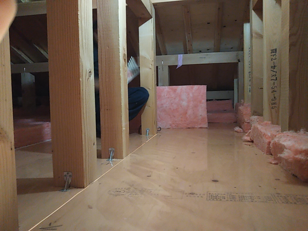 2階の小屋裏には断熱材を敷き詰めておきます。真夏の日射は上空からほぼ垂直に照り付けてきますので、天井あるいは屋根面の断熱材はある程度壁よりも厚めに施工しておきます。後々点検できるように小屋裏点検口も設けますが、この部分だけ熱的にスカスカでは画竜点睛。点検口も断熱材でできたものを使用して、性能が落ちるのを防ぎます。