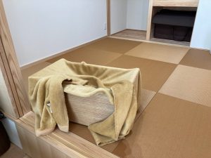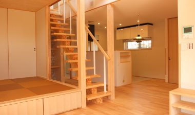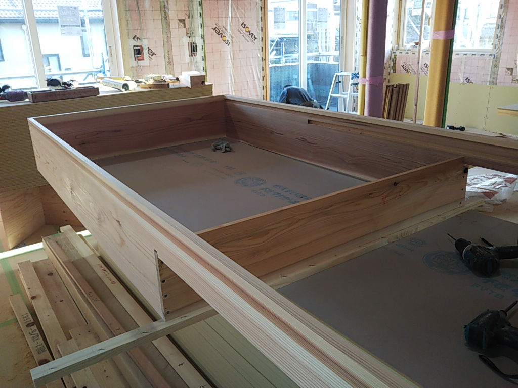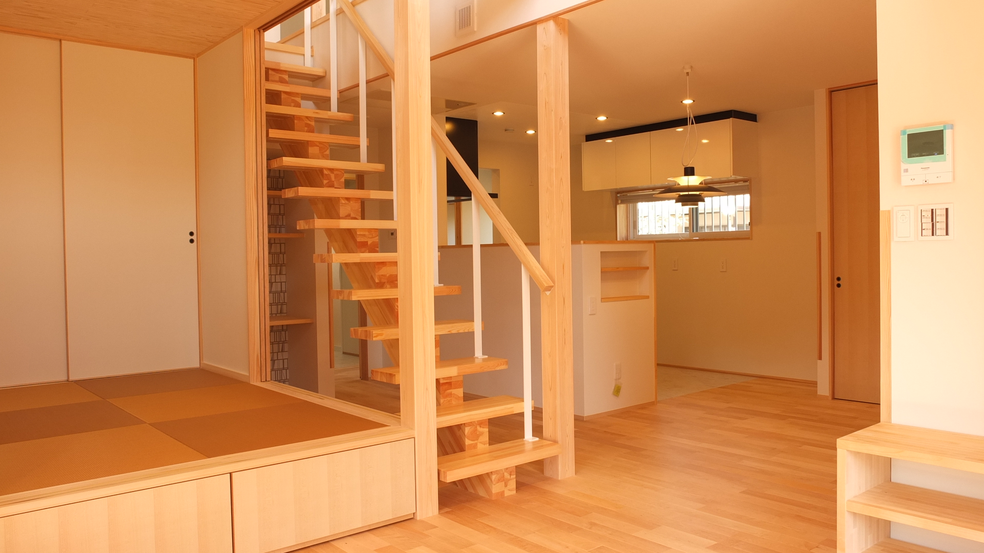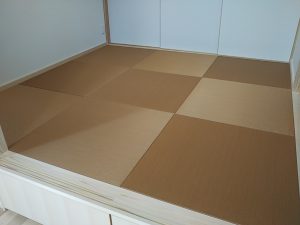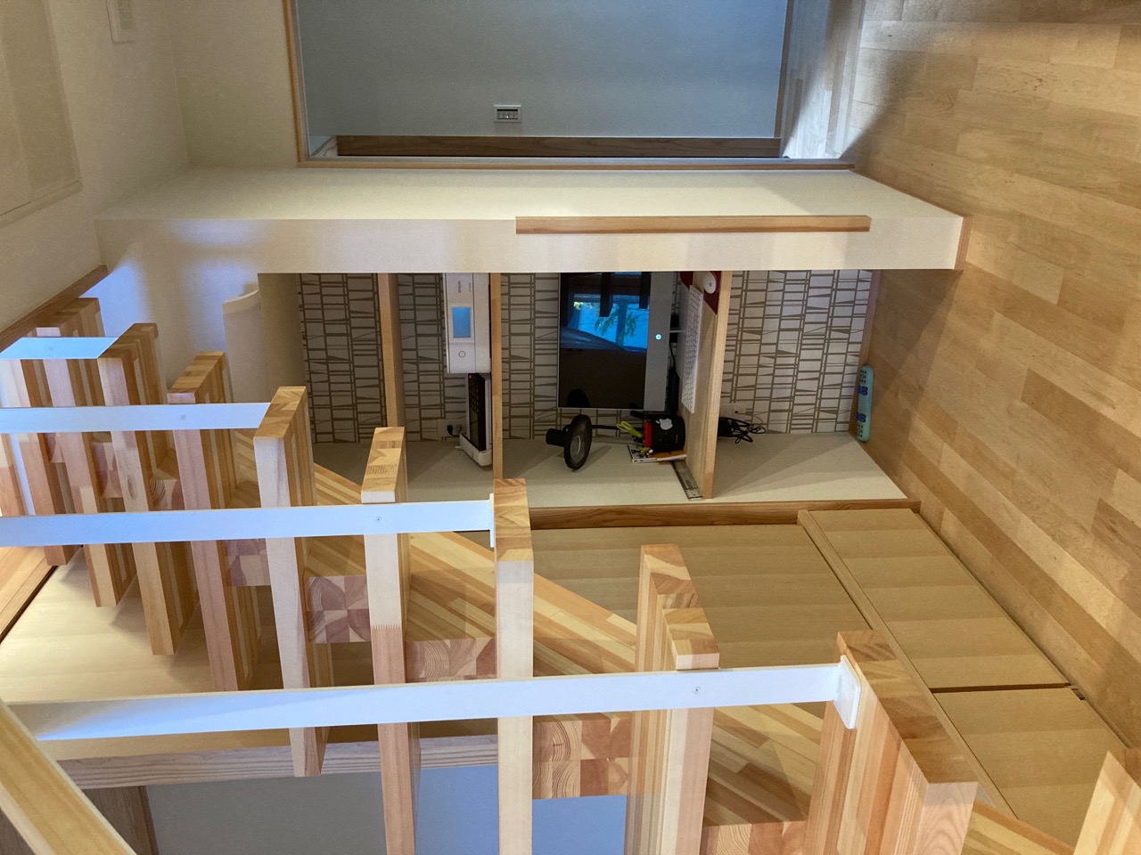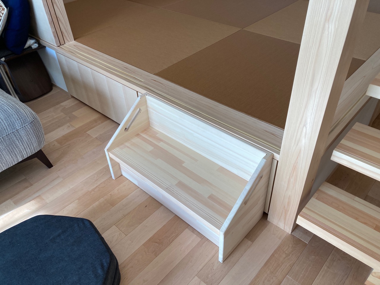 タタミコーナーは1階の床から40㎝の高さに設定しています。一般的にだいたい椅子の座面と同じくらいの高さとし、脚を下ろして座って使用できるようにとこの高さとしています。今回はy様から40㎝の段差の上り下りを少し楽にするためのステップ台が欲しいとの事で作成してみました。高低差半分の20㎝の高さに一段踏面をつくります。