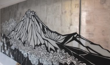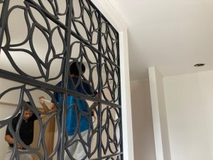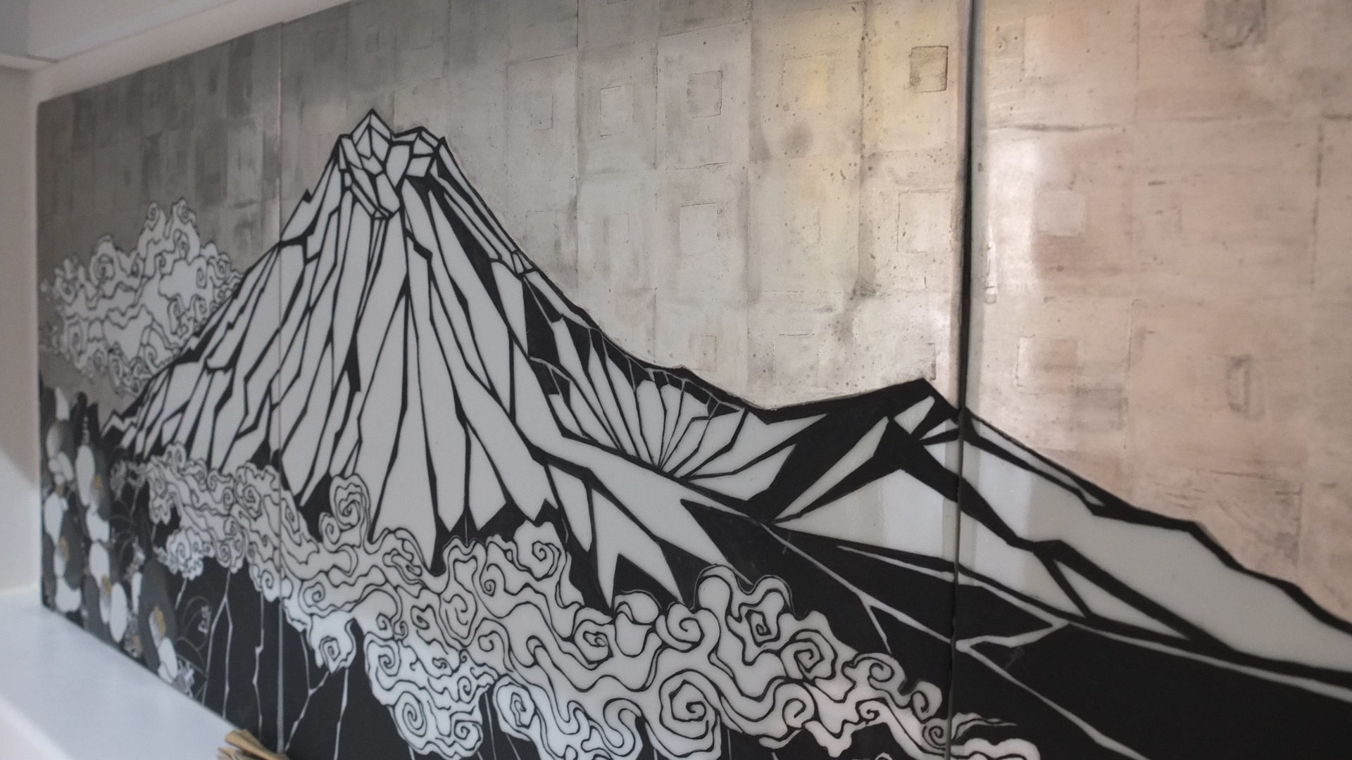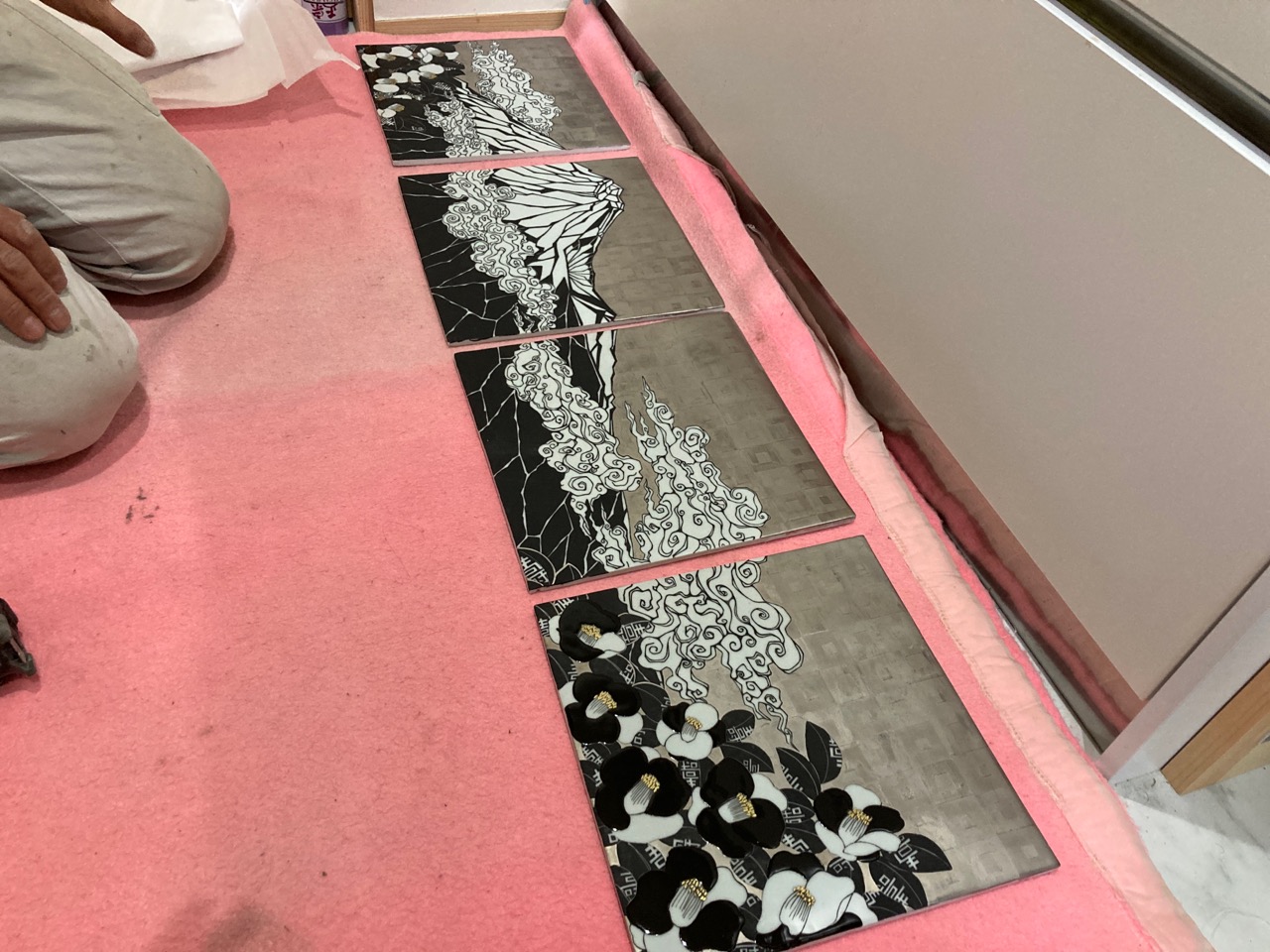 私自身はできあがりの状態は写真では見ていたのですが、実物を拝見するのは今日が初めて。さすがは絵師の先生、改めて見ると圧巻の絵柄です。一点物の陶板なだけに毛布での養生も厳重に行い、貼付け開始です。左官業者さんも緊張の手作業、手が震えてもいけないので完了するまで詳細は話していません。