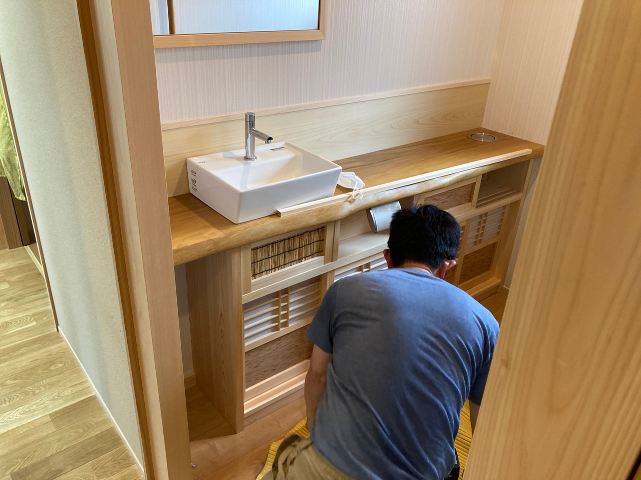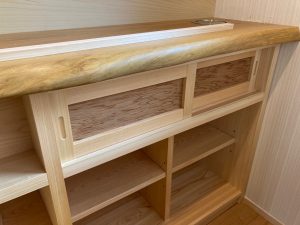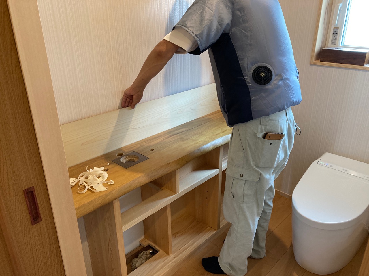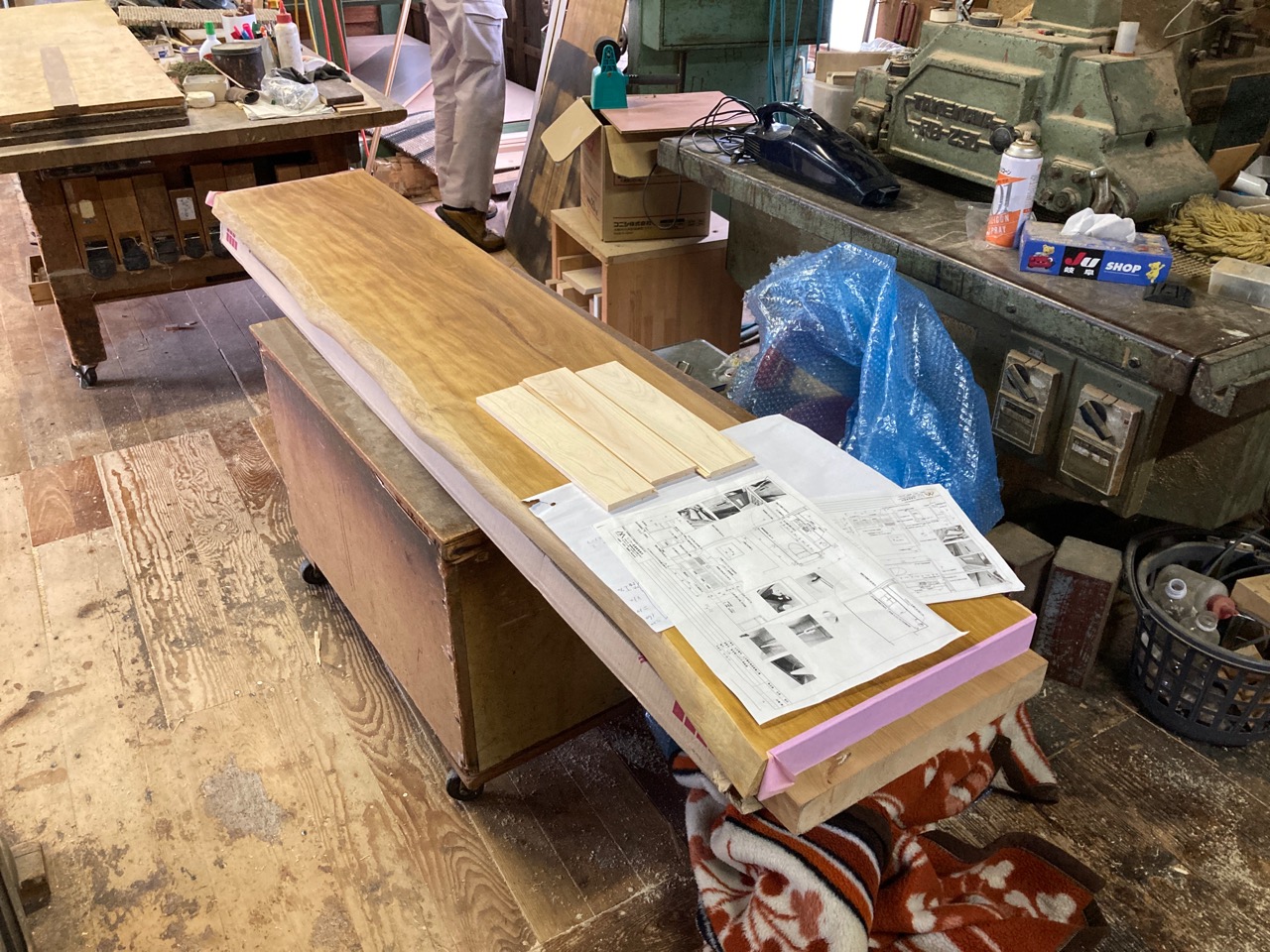 竣工時に取付けた造作のトイレ手洗いカウンターをもう少しグレードアップしたいという事で、欅の耳付き一枚板を天板とした造作収納カウンターを計画しました。家具工房の木工所で仕上げられ、これから取り付けにうかがいます。本来は玄関先に取付けても良いような材料で製作。贅沢なトイレ空間になりそうです。