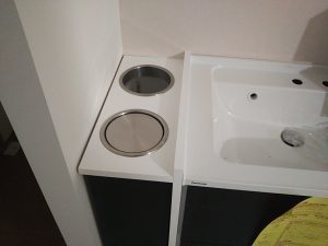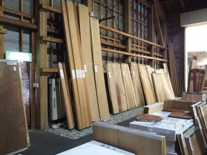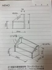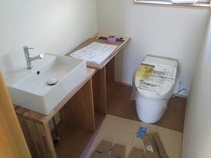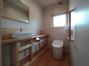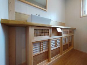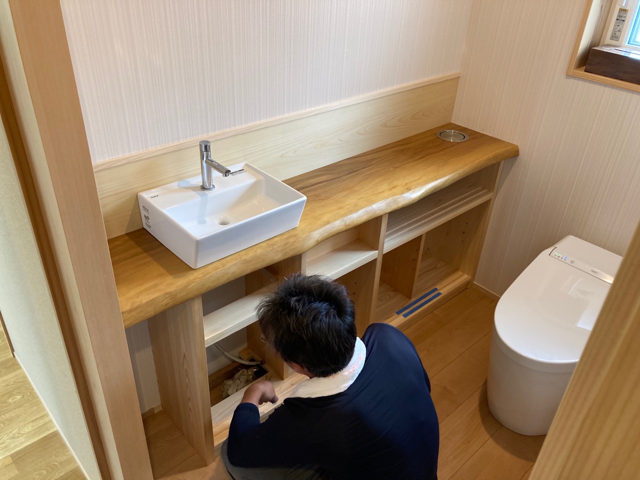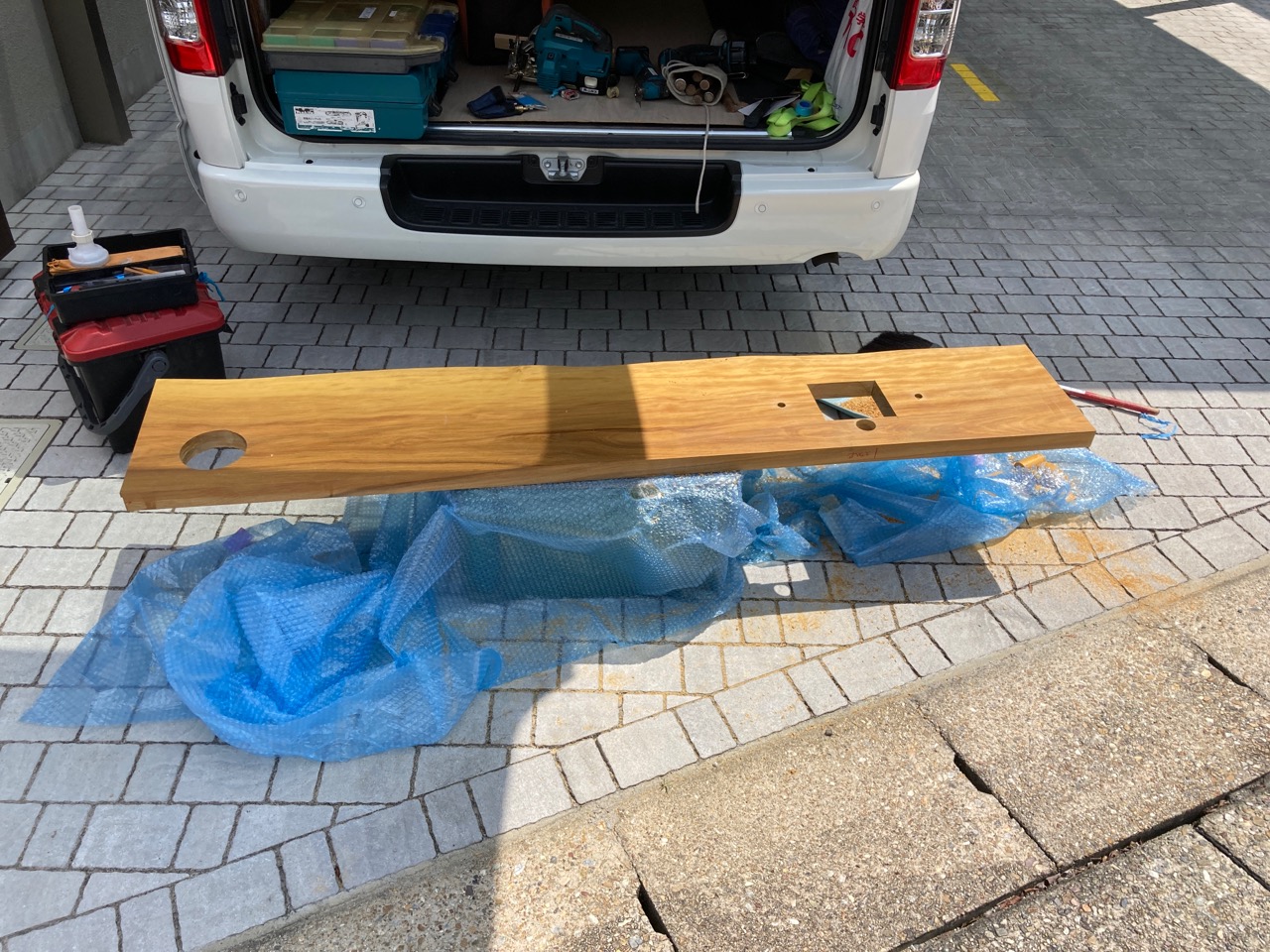 竣工時に取付けた造作のトイレ手洗いカウンターをもう少しグレードアップしたいという事で、欅の耳付き一枚板を天板とした造作収納カウンターを計画しました。家具工房の木工所で仕上げられ、これから取り付けにうかがいます。本来は玄関先に取付けても良いような材料で製作。贅沢なトイレ空間になりそうです。