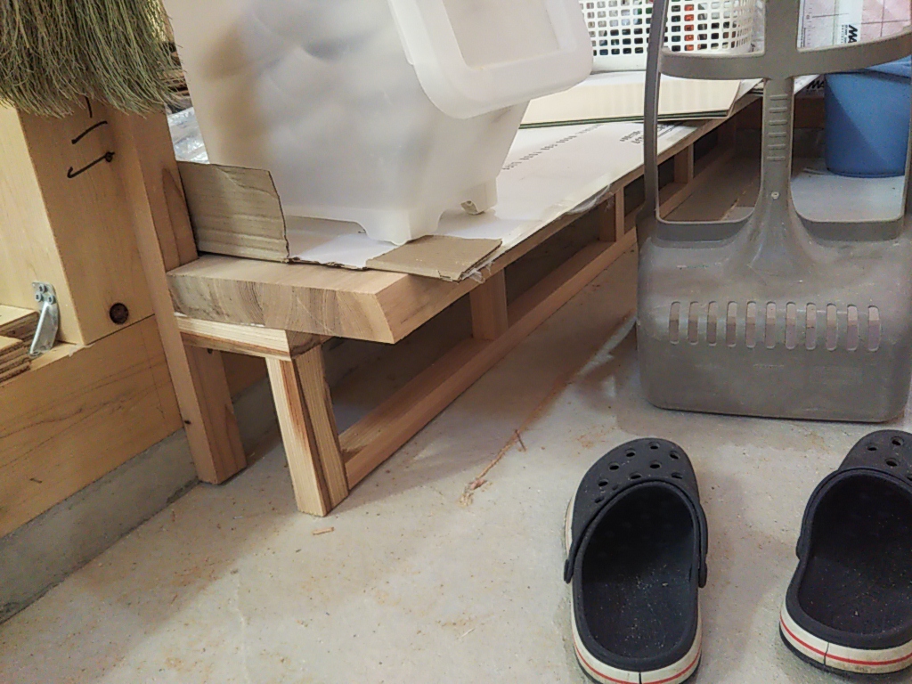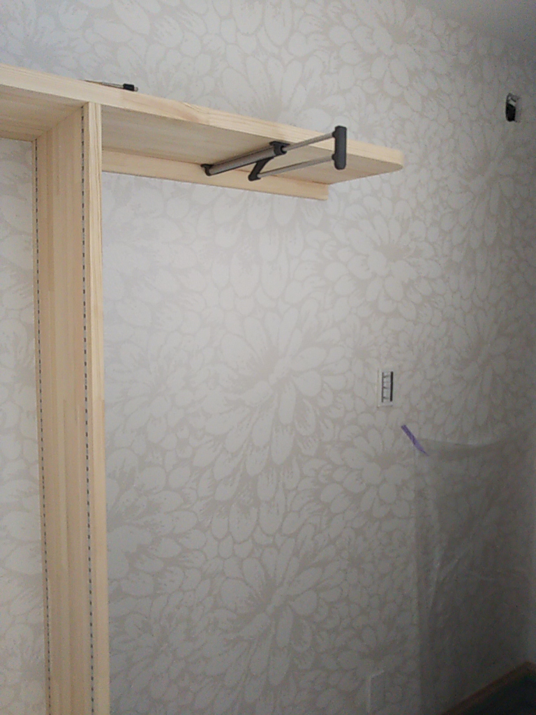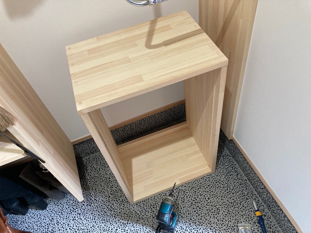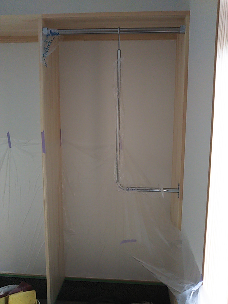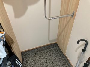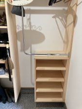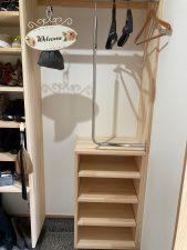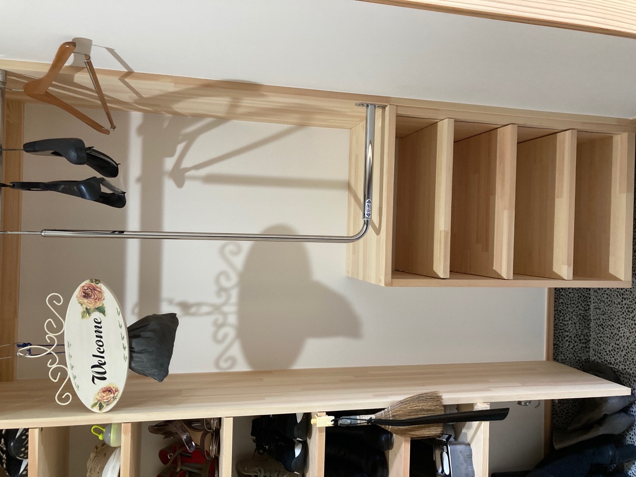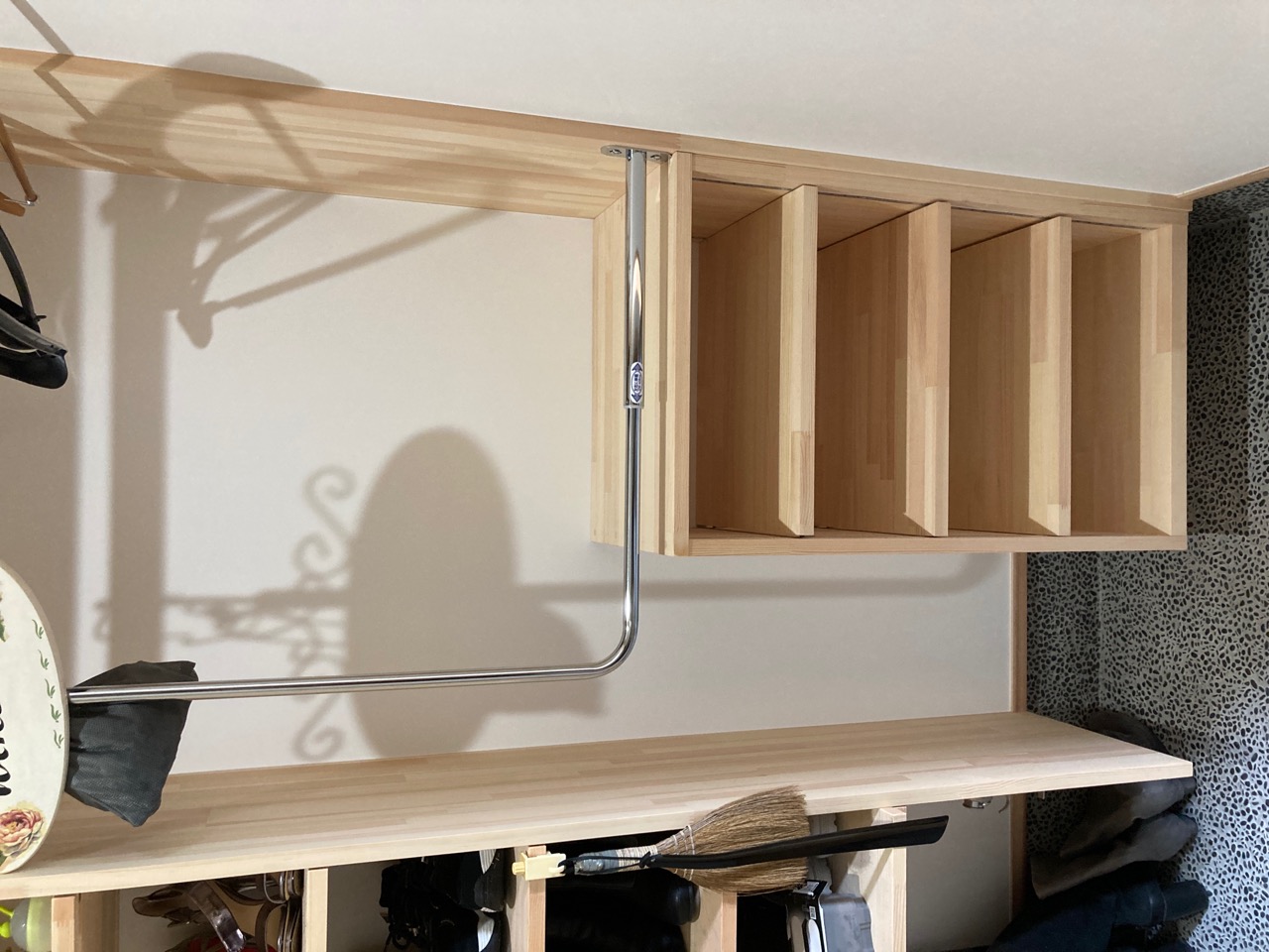 玄関収納内の下足入れ棚増設。棚の固定を終えました。棚の上部にあるハンガーパイプは横方向に伸び縮み式です。冬場は縮めておきロングコートなど長いものを掛ける。夏は伸ばしておき、短いジャケットなどを2段に分けて掛ける、といった使い方ができます。