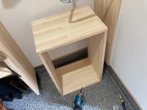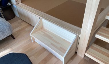 できあがった台を設置にうかがいました。底面に貼り付けた滑り止めクッション材も含めてクリアランスを見ておいた寸法の中に納まり、一安心です。ステップとして使用しない時は部屋の片隅に移動してディスプレイの台にされるとの事です。