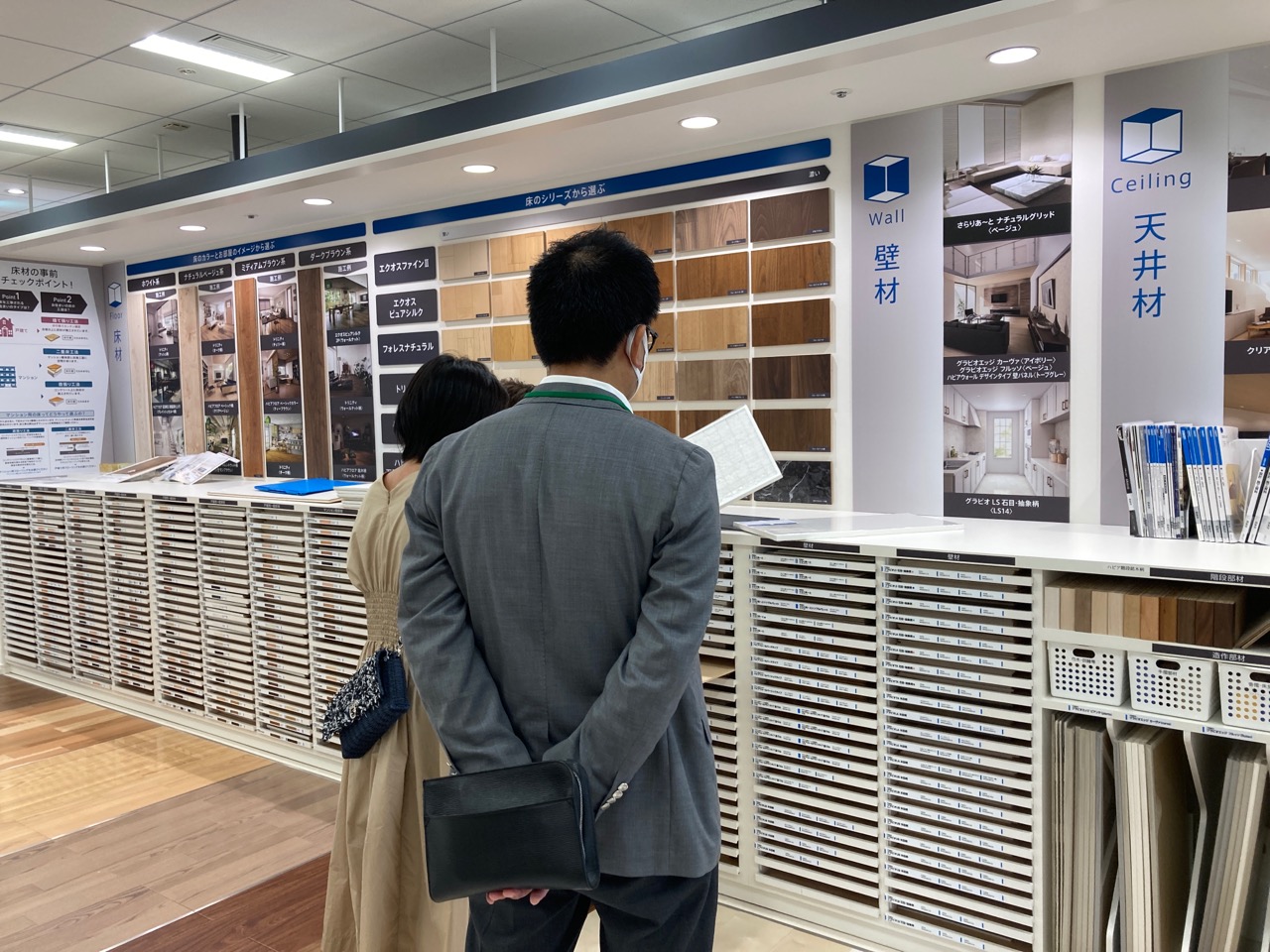 春先にお引渡しして間もないy様邸ですが、実際にお住まいになって、『もう少し手を加えたい』との事で建材のショールームへやってきました。比較的置き家具が少ない室の反響音を防ぐために吸音、遮音の内装材の実物を確認検討します。