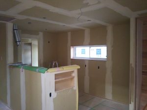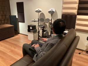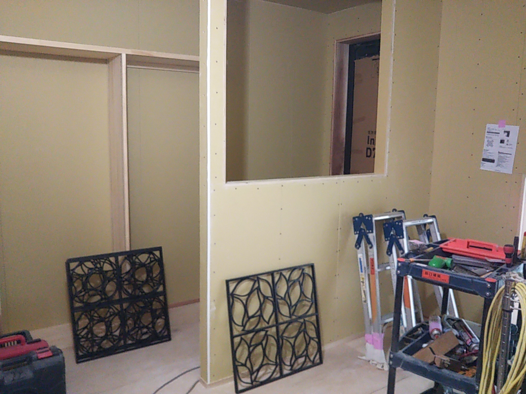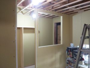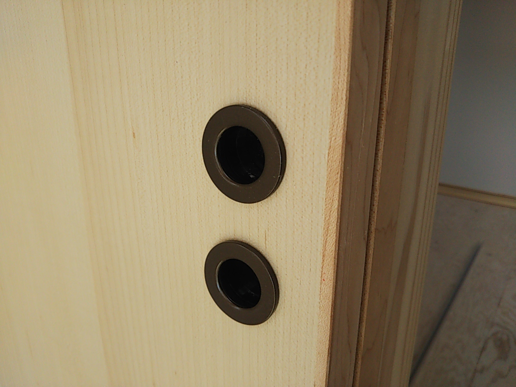 この部屋から他の部屋への音漏れの対策として建具も新調しました。元々は『フラッシュ戸』という内部が空洞になった建具を建て込んでいましたが、新たに空洞内に遮音効果を期待してグラスウールを詰め込み、表面下地に遮音シートを張った防音建具としました。