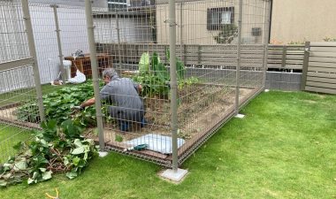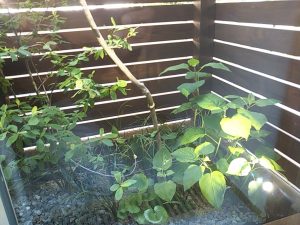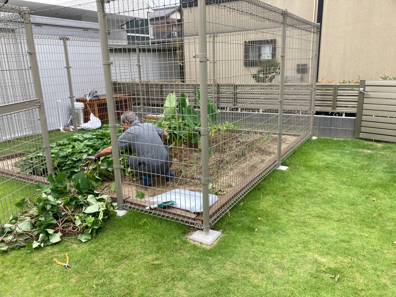 久しぶりに訪れたら庭の一角の菜園にフェンスが施されていました。主に猫対策と思われます。菜園ではy会長様が野菜作りに余念がありません。いま間引いているのはさつまいもの葉だそうです。