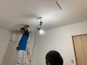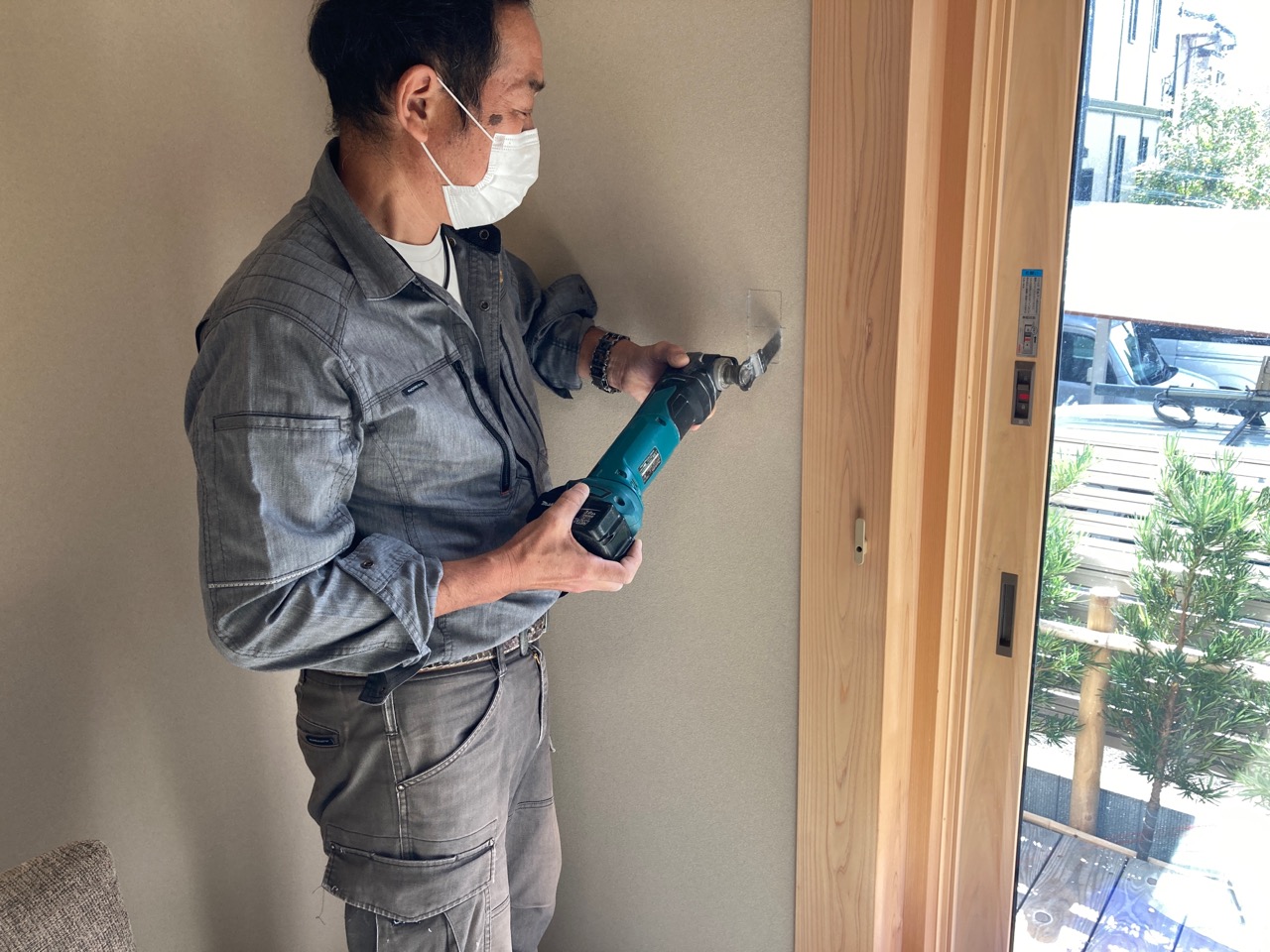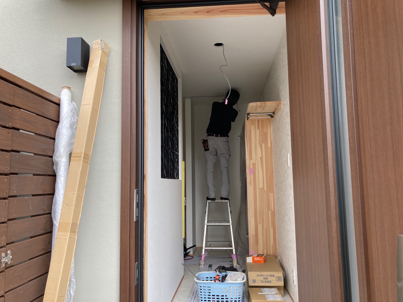 今回は外部の照明器具を増やしたい、というご依頼でうかがいました。先月、換気扇を増設するために押入天井裏に開けた点検口が活かされ、ここから反対側の壁へと電力供給のための配線が這わされます。