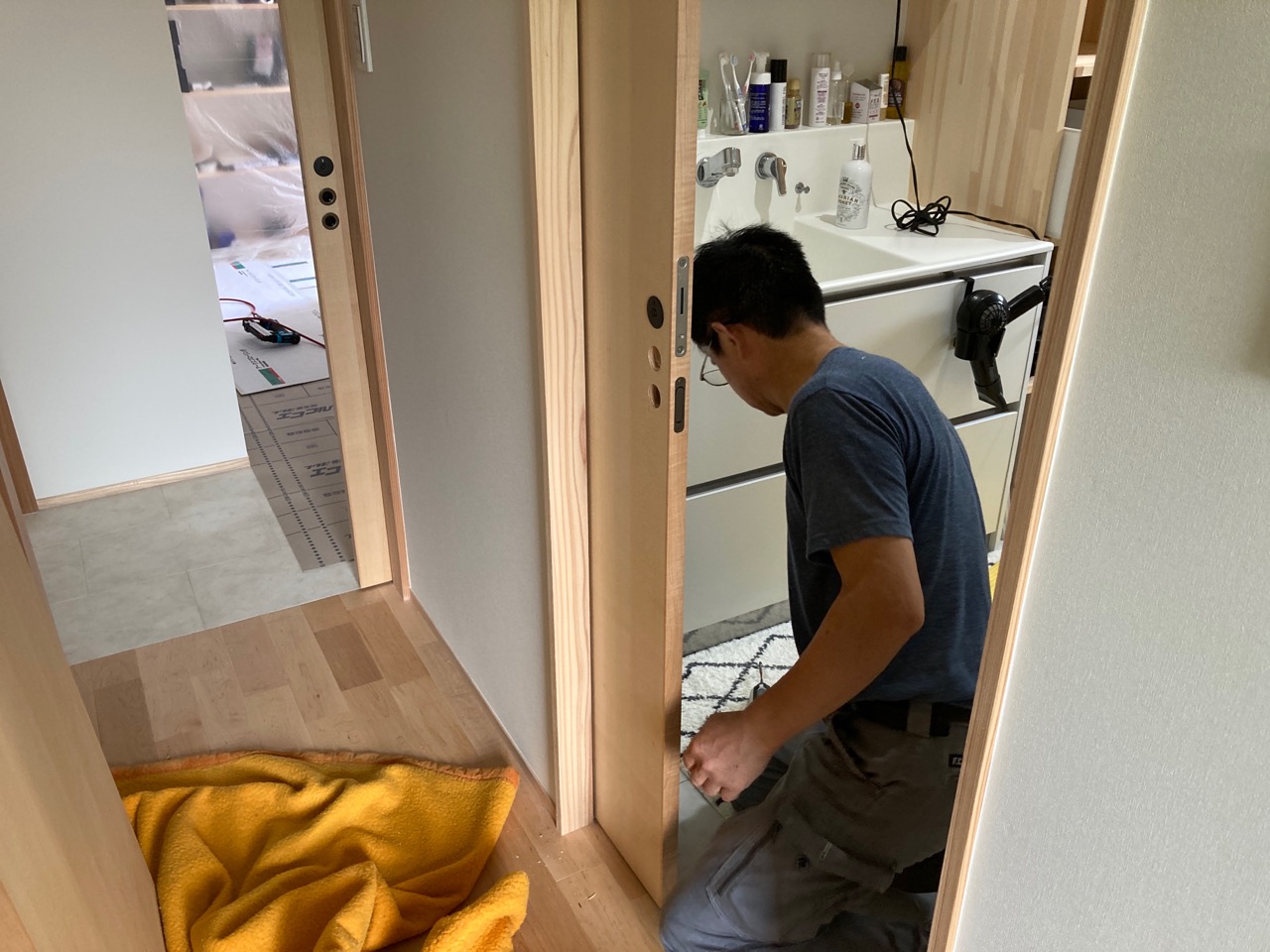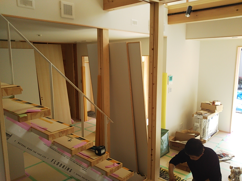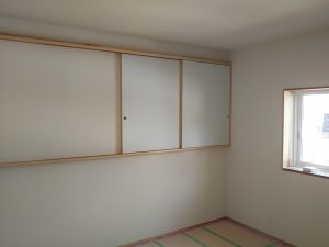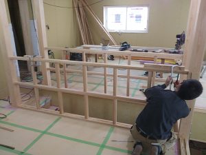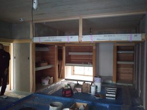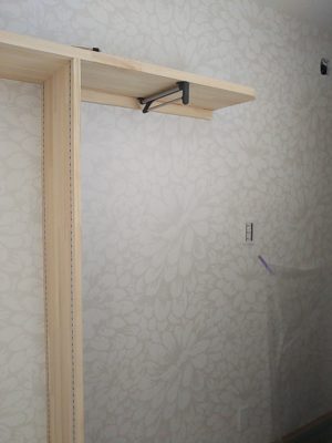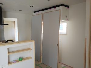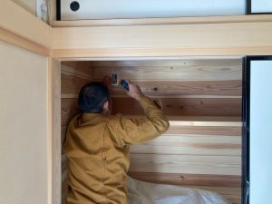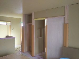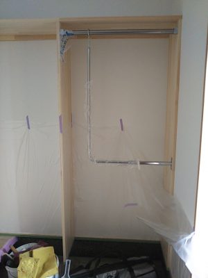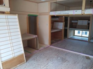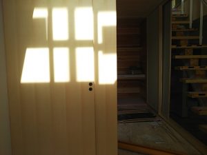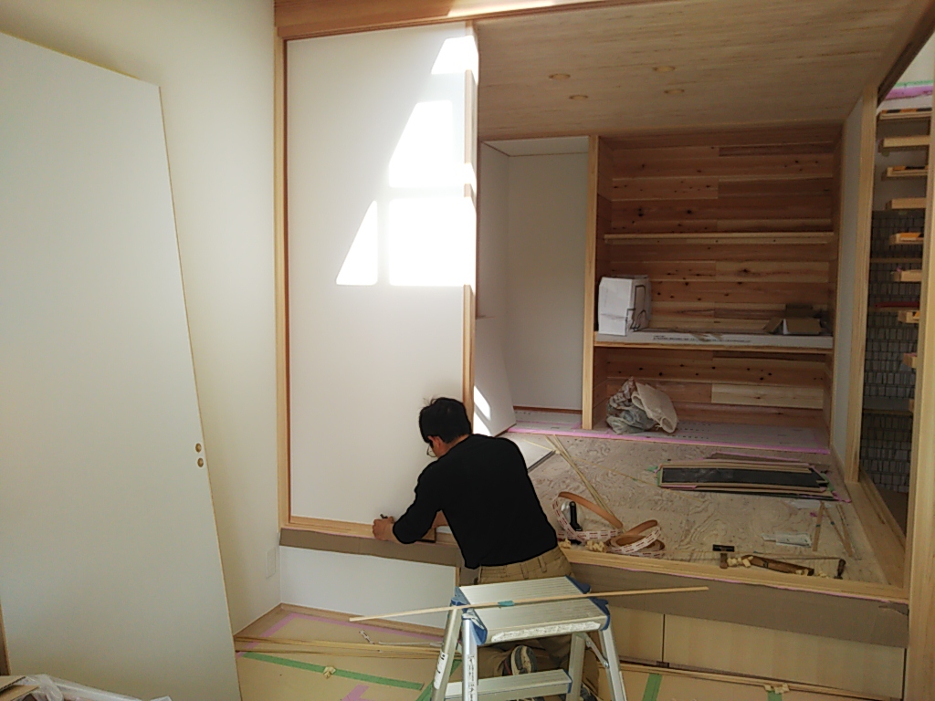 収納の建具を建て込み。y様のご希望で和風の建具を製作して建て込んでいきます。