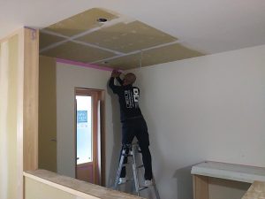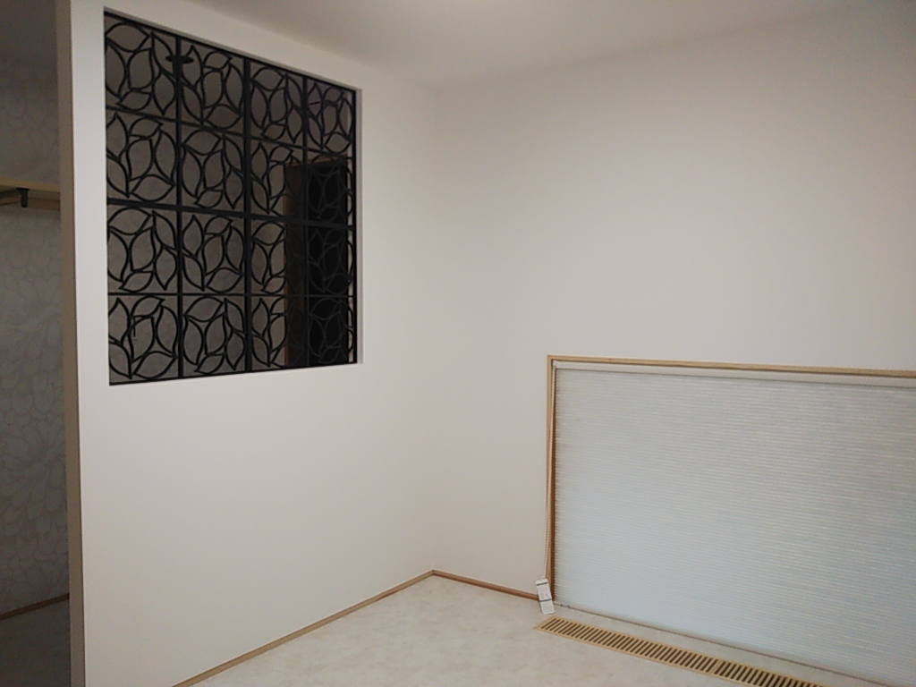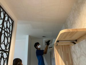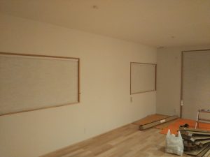 本日は東世帯の奥様の作業室の小改修にやってきました。あまり家具を置かない部屋のため比較的声が反響するため、吸音天井を張りたいとの事。先日ショールームを見学した際に吸音性能はご確認いただいていました。