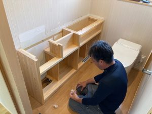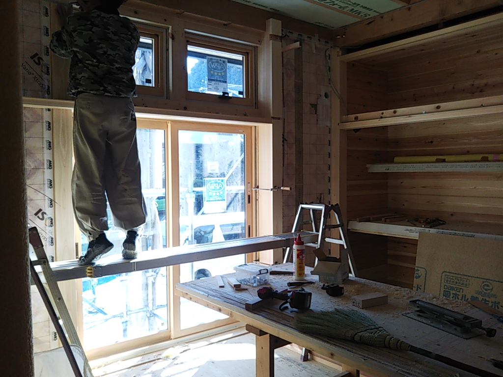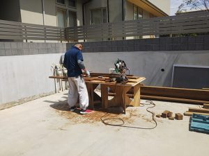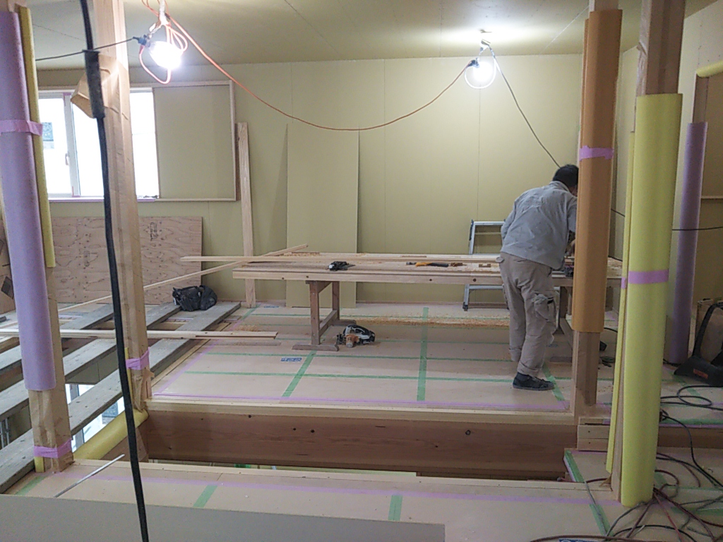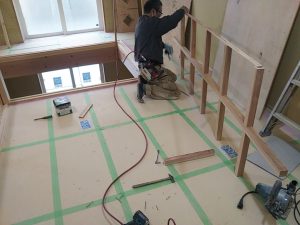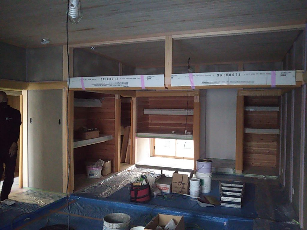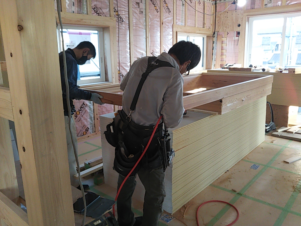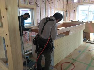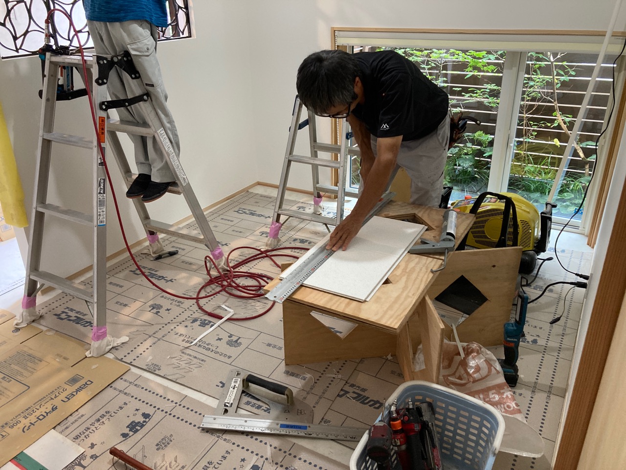 作業をするのは新築工事の際にも造作を行ったt口棟梁と息子のf志君。下で材料を切り、上で材料を貼っていく連携作業です。