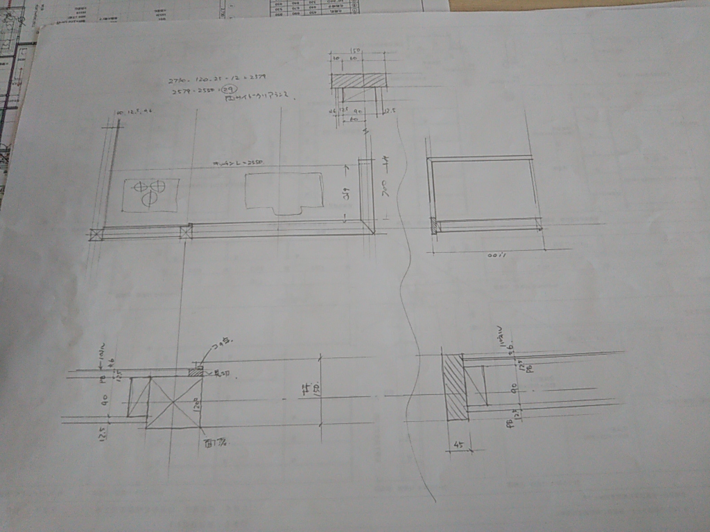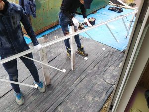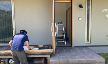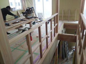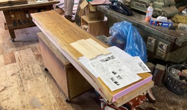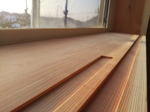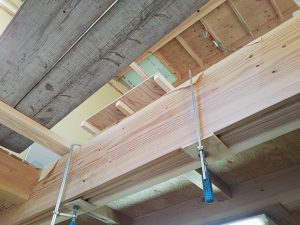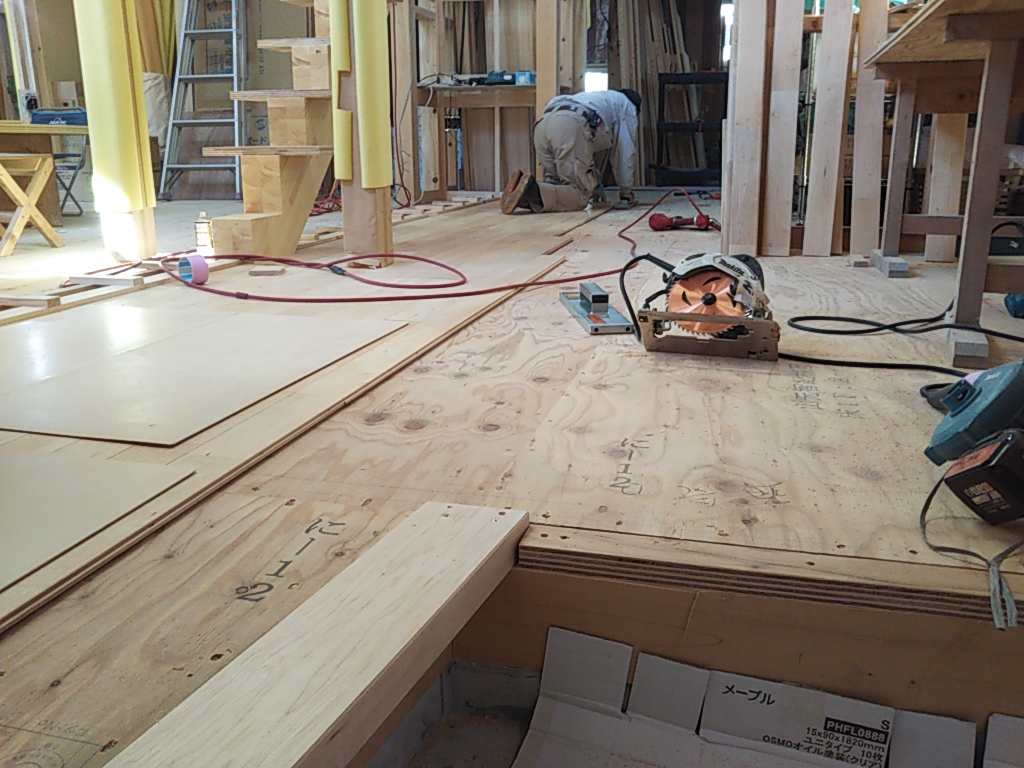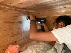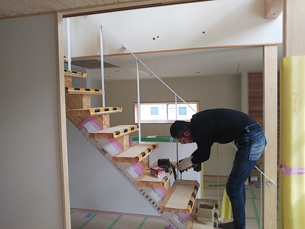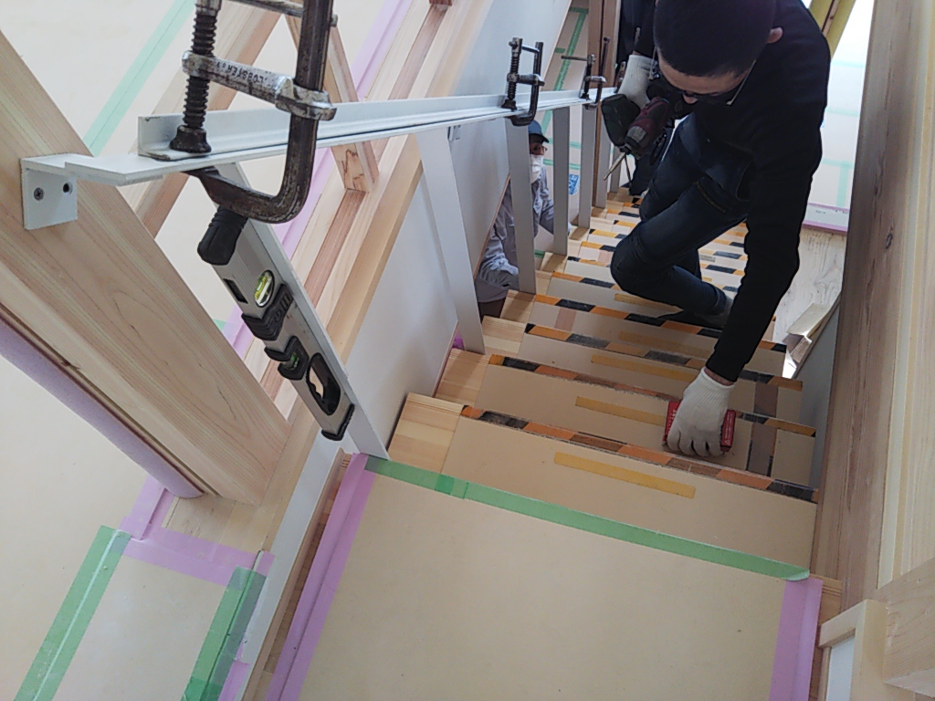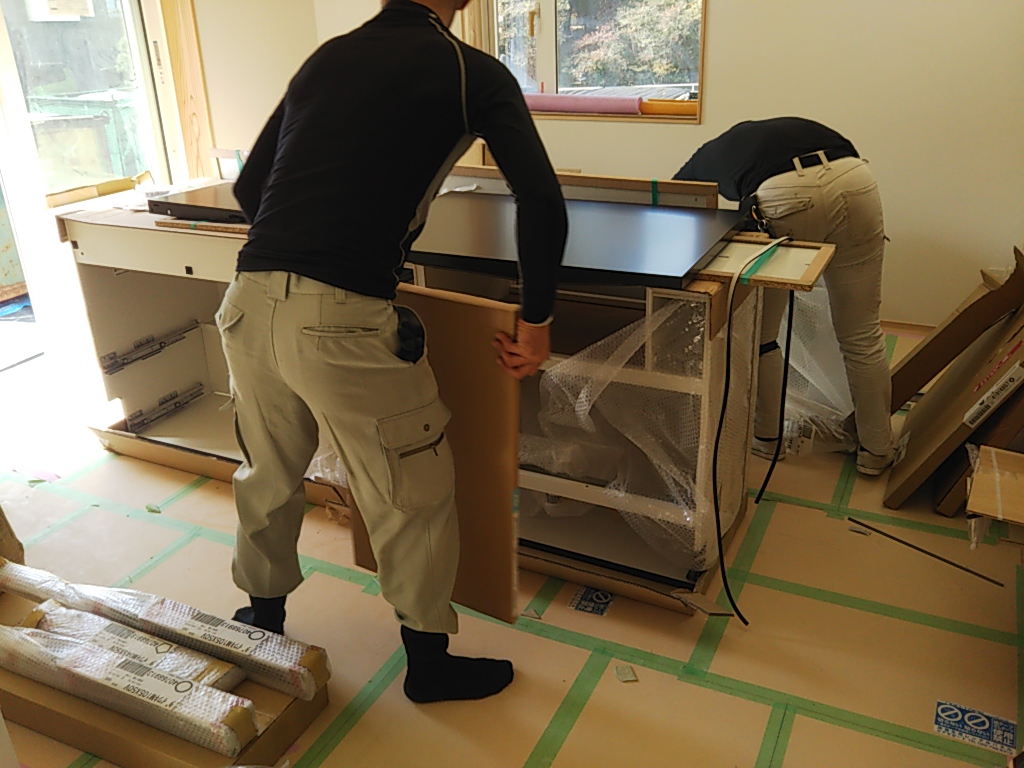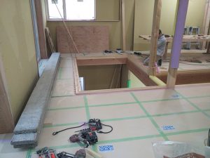 作業をするのは新築工事の際にも造作を行ったt口棟梁と息子のf志君。下で材料を切り、上で材料を貼っていく連携作業です。