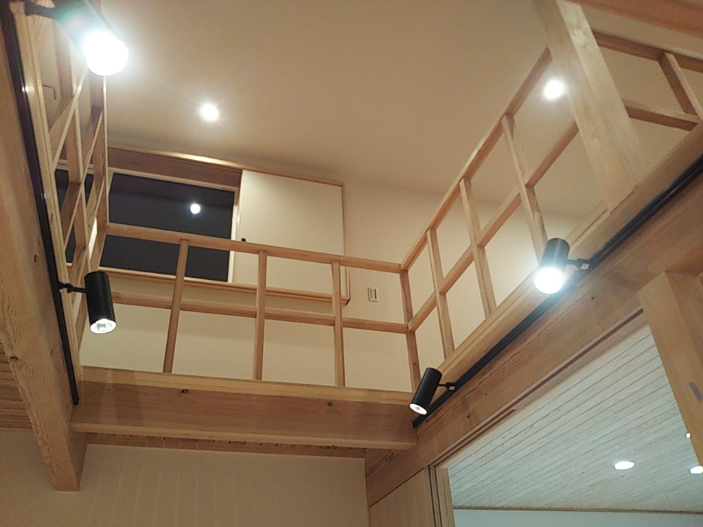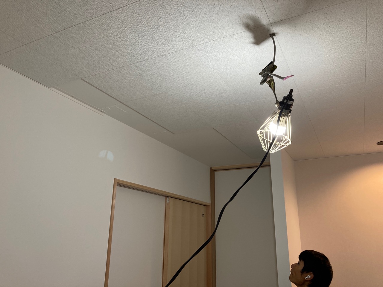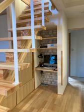 階段下の小パソコンスペースに照明器具を追加する工事にうかがいました。このコロナ禍の時勢、どうしてもテレワーク作業が多くなりがちですが、このスペースでは画面が少々暗い、との事で照明器具を取付けます。すでに仕上がっている壁天井に配線を露出させたくはないのであの手この手を考えて天井裏や壁中に配線を這わせていきます。