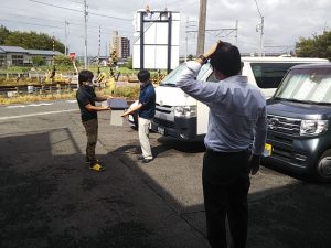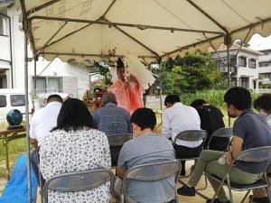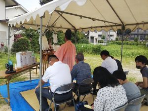 九州地方では甚大な被害をもたらした梅雨の長雨も明け、本格的な暑さがやってきたこの日、現場で地鎮祭が行われました。曇っているため日は射さず、微風も吹いていて比較的過ごしやすいかと思いきやかなりの暑さ。それでもこの夏の中ではまだ良い日に開催できたと思います。