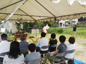祭事の前に神主さんからの講話。日本書紀、古事記の時代から連綿と続く地域と氏神様との関係性、それによる地鎮祭の役割などのお話をいただきました。地鎮祭とは土地の神を鎮めるだけでなく、以前建っていた建物(以前土地を使用していた者)から一度土地を氏神に返還し、今回新たにY様が氏神より土地を借り受けるための鎮の儀式である、という内容でした。年に数件地鎮祭に参加するこの仕事ですが、まだまだ知らない事がたくさんあります。