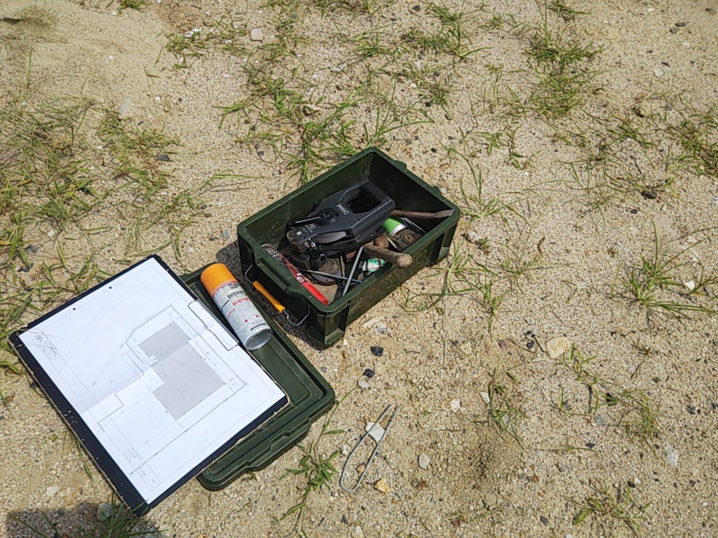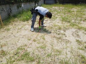 建物の配置出しを行いました。昨日の地鎮祭も暑かったのですが、今日はそれを上回る危険な暑さ。流れる汗と現場を飛び回る蚊と闘いながらの作業となります。