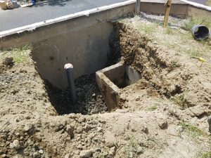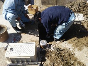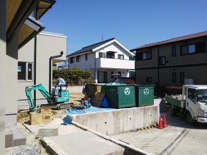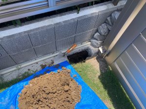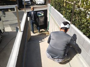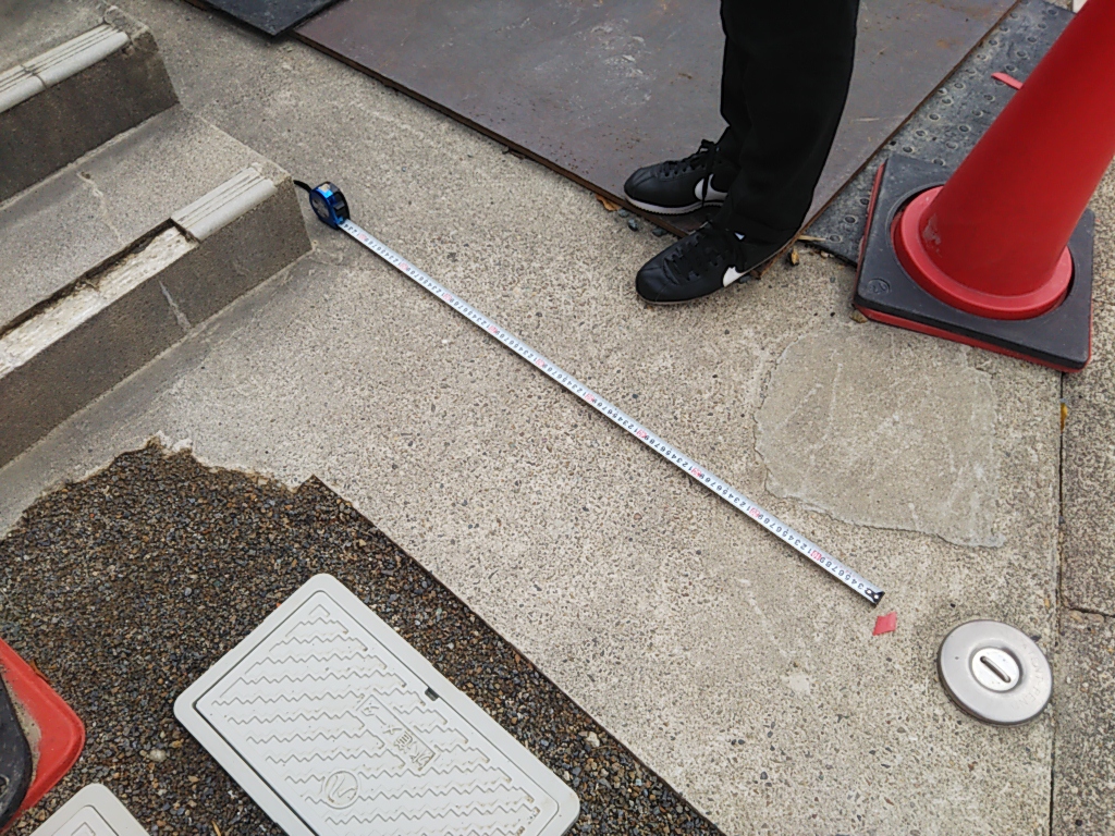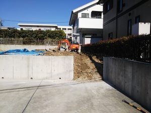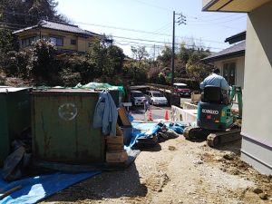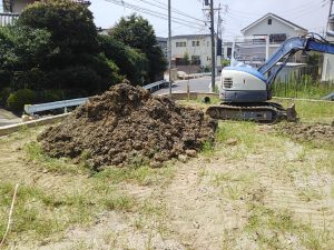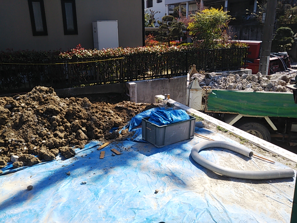 水道業者さんが下水道の道路への取り出し管を接続するため土を掘って場所を探しています。「探しています」と言っても、今回の場合道路との高低差が1m以上あり、道路面への接続管を探すだけでも重機を持ってきて徳川埋蔵金のように探し当てる必要があります。(大体の場所はわかっていますが)暑い中ご苦労様です。