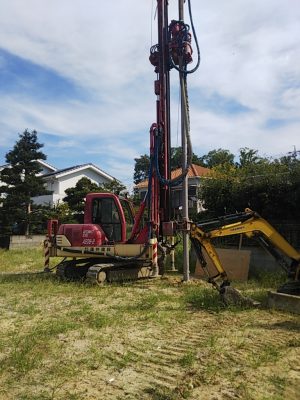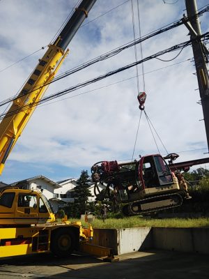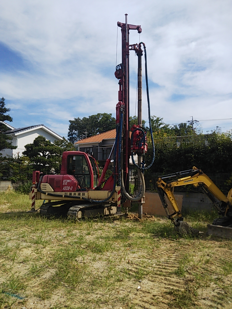 夏季休業も終わり、本格的に工事スタートです。地盤調査の結果改良が必要となりましたのでセメントミルクによる湿式柱状改良を行います。それにしても地面に柱を掘る重機をどうやって一段高い敷地まで上げるのだろうと考えていたところ、業者さんは大型のクレーンを用意、アースオーガーという地面を掘る重機を軽々と持ち上げて敷地に設置しました。