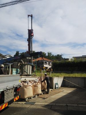 改良剤も搬入され、準備OKです。アースオーガーを地面に打ち込んでいき、先端からセメントを流し込みながら引き抜く事で地中に柱状のコンクリート杭を形成する工法です。