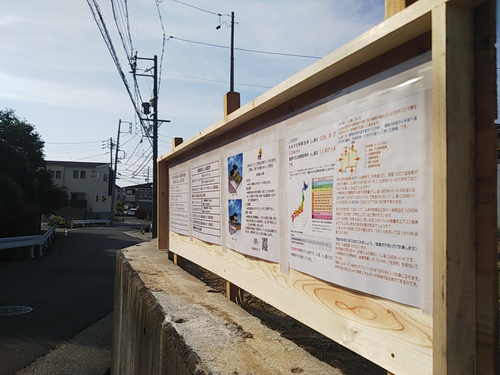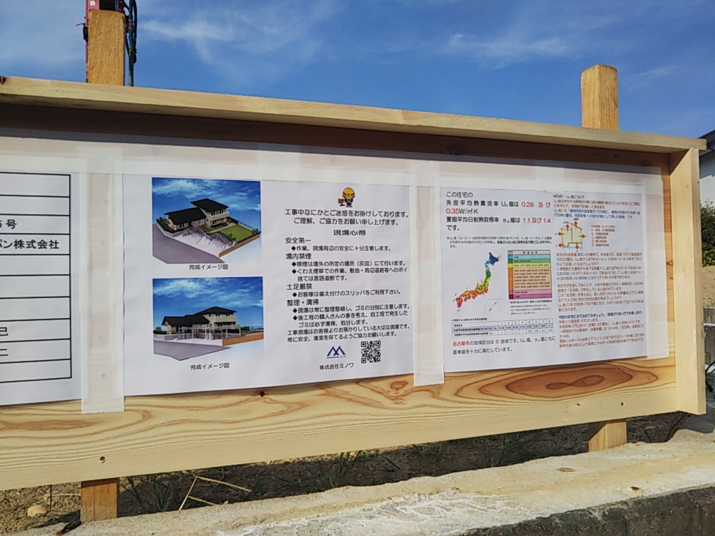 建築概要の横に今回計画住宅の断熱能力を簡単に説明したものも掲示しました。ミノワがどれほどの性能を持った住宅を建てているか、という事を知っていただくために描いたものですが、道行く人は一見しただけでは『?』となると思います。高気密高断熱住宅にご興味のある通行人の方は、その横に掲示したQRコードで当ホームページまでたどり着いて欲しいと思います。