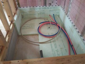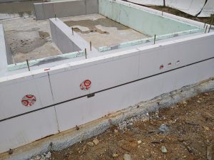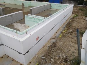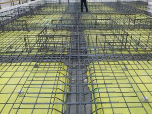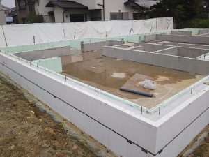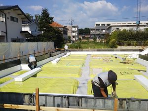 今回も付加断熱を施すために、鉄筋を組む作業の前に型枠内に断熱材を仕込みます。ビーズ法ポリスチレンフォームという名の板状の断熱材です。発泡スチロールの強力版と思っていただければ想像しやすいと思います。