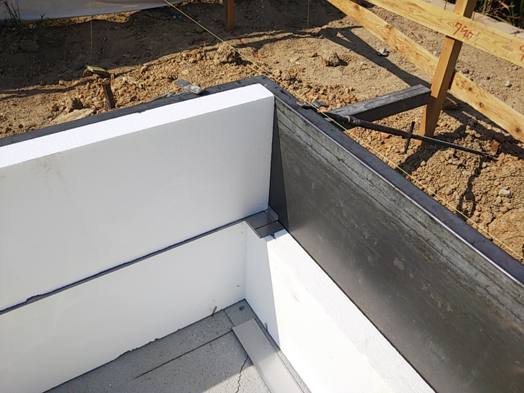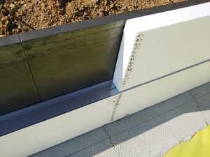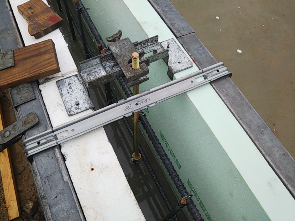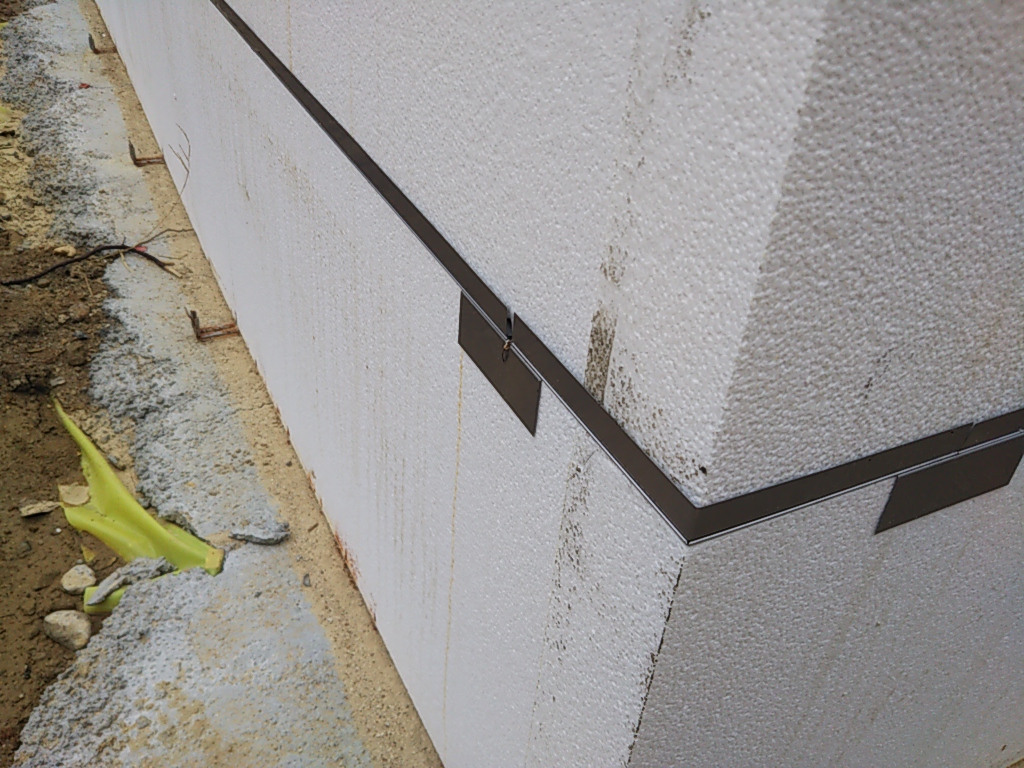 いずれの断熱材もコンクリートと一緒に打ち込みますのでぴったりと密着しているのですが、外側の断熱材とコンクリートの間は下端が土中に埋設されることになります。その間を白蟻が断熱材を喰いながら(断熱材でも喰って行ってしまうそうです)土台まで到達されてしまうと、宅内への進入を許してしまいます。なまじ断熱材の裏側を通られると蟻道も見えないので対処に困ります。そこでミノワでは『シロアリストッパー』なる部品を使います。