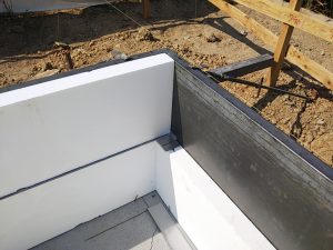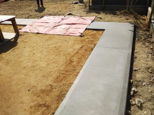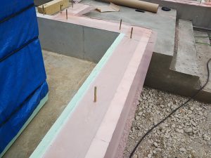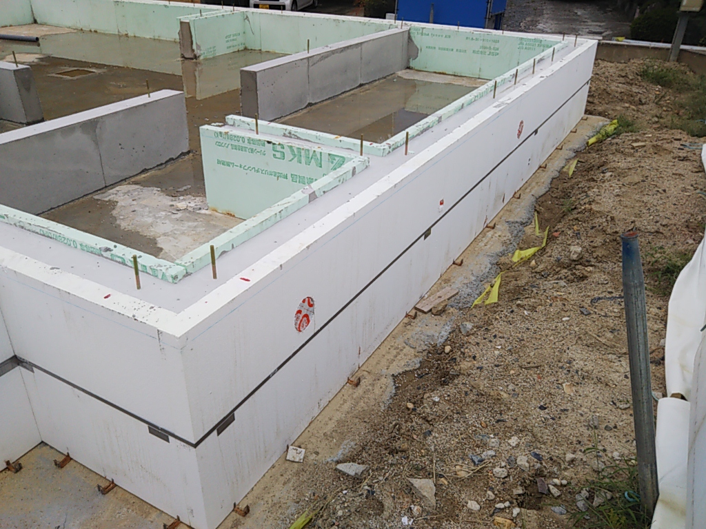 基礎の型枠が外されました。今回は基礎コンクリートの内側外側両方に垂直に断熱材が敷設されます。内側には押出法ポリスチレンフォーム【商品名ミラフォーム】、外側にはビーズ法ポリスチレンフォーム【商品名パフォームガード】、いずれも発泡スチロールのもう少し硬い材料と思ってもらえれば想像しやすいと思います。