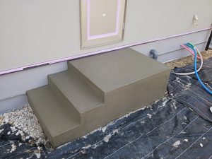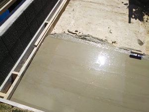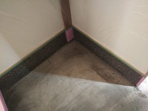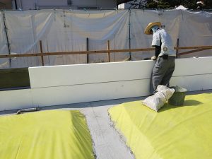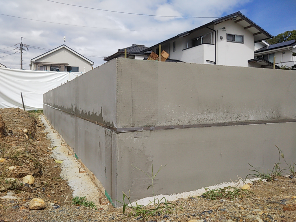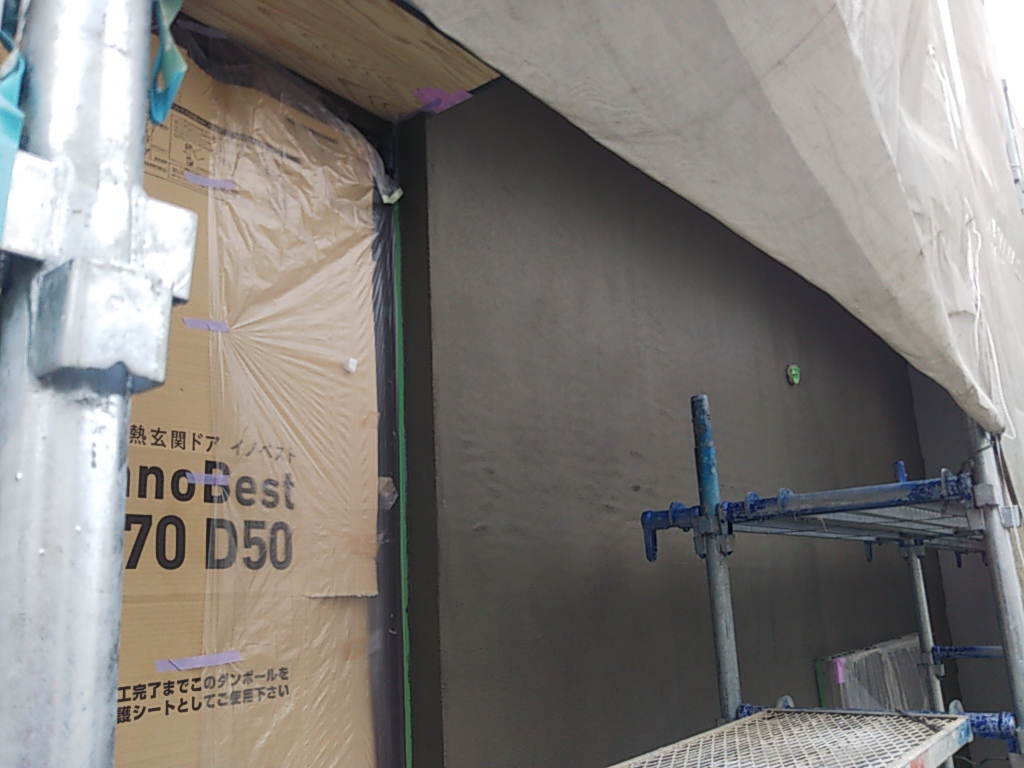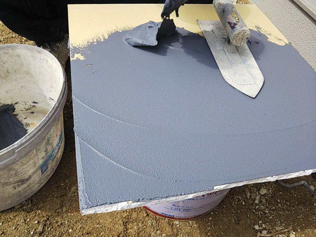 基礎コンクリートの外側に敷設している断熱材の外側に仕上材を塗り付けるための下地材を先行して塗り付けました。外見から見ると色からしてコンクリートに見えますが断熱材です。手で軽くたたいてみると違いが分かります。