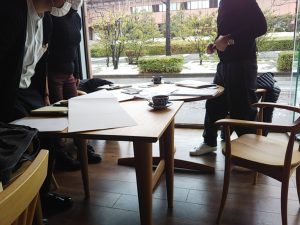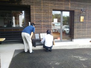 できあがったテーブルを設置にうかがいました。と言っても搬入して置くだけですが。2階の多目的なホールには現在観葉植物がいっぱい置いてあります。その中で小鉢の物を飾っておくのに使用されれるとの事です。