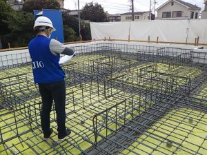 基礎配筋の検査にやってきました。日本住宅検査機構(JIO)の規定によりミノワ社内の有資格者による自主検査が認められているので、通常であれば筆者が検査を行うところですが、今回のy様邸は普通の住宅ながら建築基準法上の『一戸建ての住宅』ではないので自主検査はできずJIOの検査員の方にチェックをお願いしました。